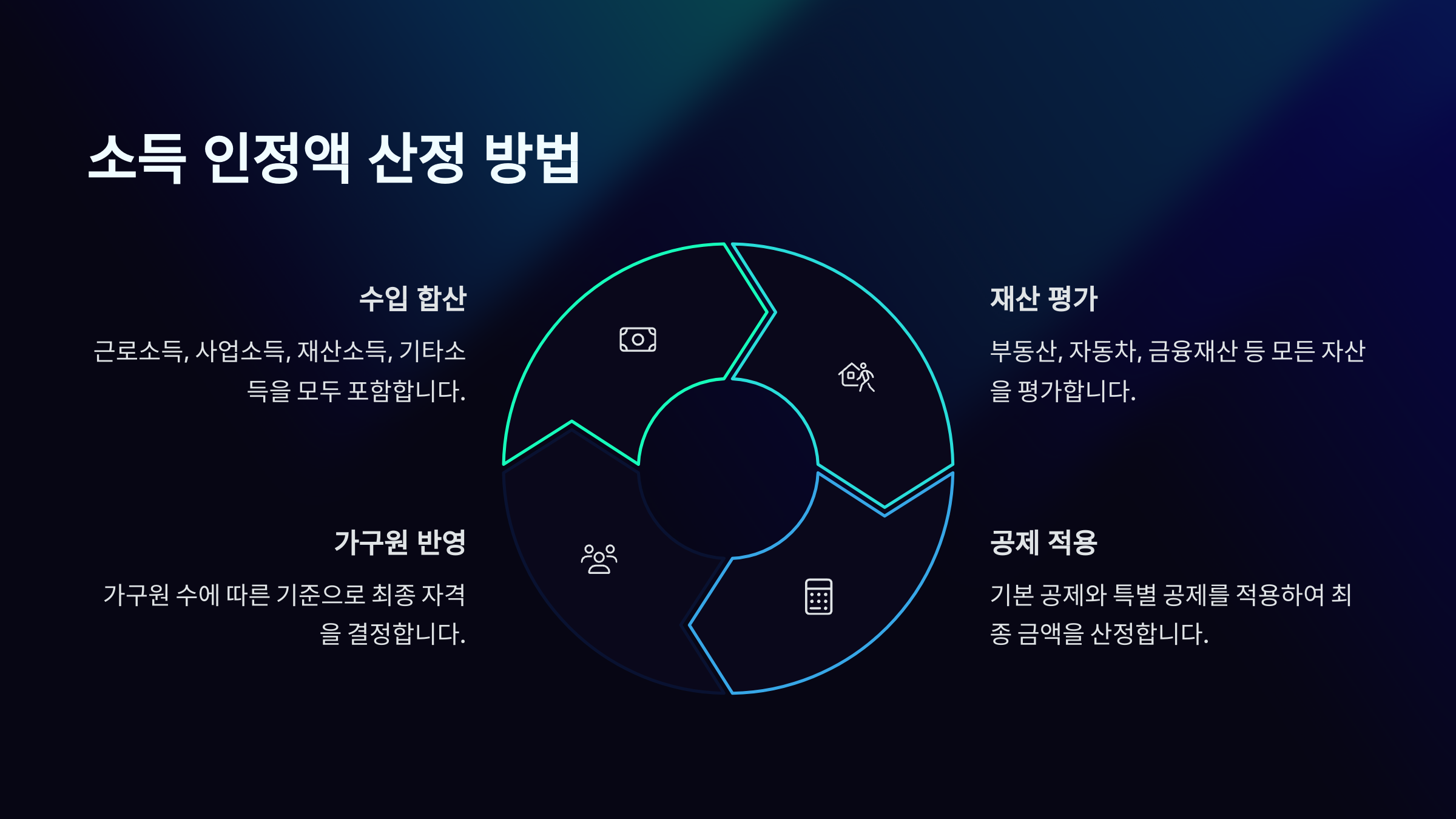 재산의 소득환산액 계산은 더 복잡해요. 재산은 일반재산, 금융재산, 자동차로 나뉘어져 있고, 각각 다른 환산율을 적용해요. 일반재산은 기본재산액을 공제한 후 월 4.17%를 곱하고, 금융재산은 2,000만원을 공제한 후 월 6.26%를 곱해요. 자동차는 배기량과 연식에 따라 다르게 계산되는데, 생업용 자동차는 50%만 반영해요.
