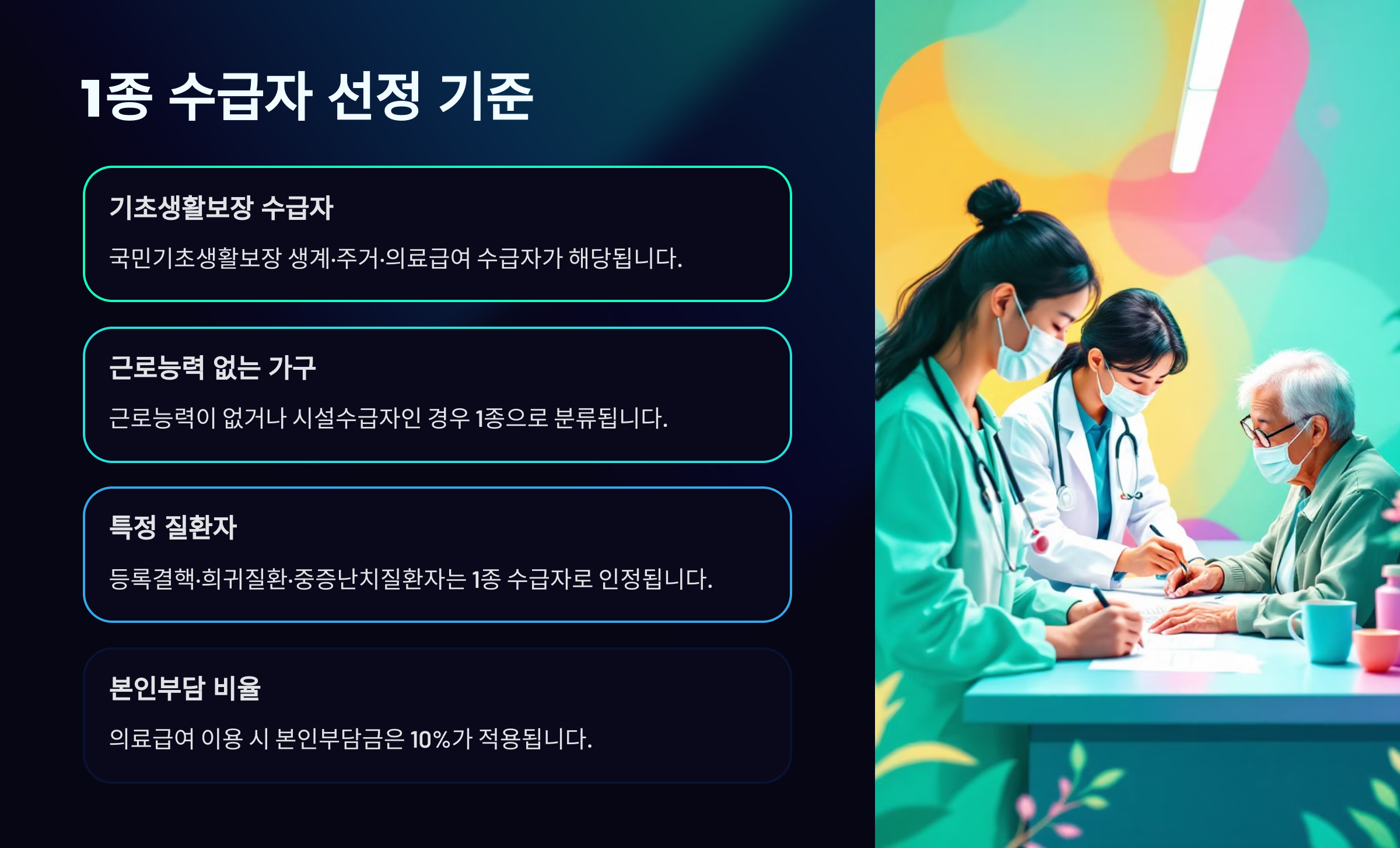 1종 의료급여 수급자는 국민기초생활보장 수급자 중에서 근로능력이 없는 사람들을 대상으로 선정돼요. 가장 기본적인 조건은 소득인정액이 생계급여 선정기준 이하여야 한다는 점이에요. 2025년 기준으로 1인 가구는 월 713,102원, 2인 가구는 1,178,435원, 3인 가구는 1,508,690원, 4인 가구는 1,833,572원 이하의 소득인정액을 가져야 해요.