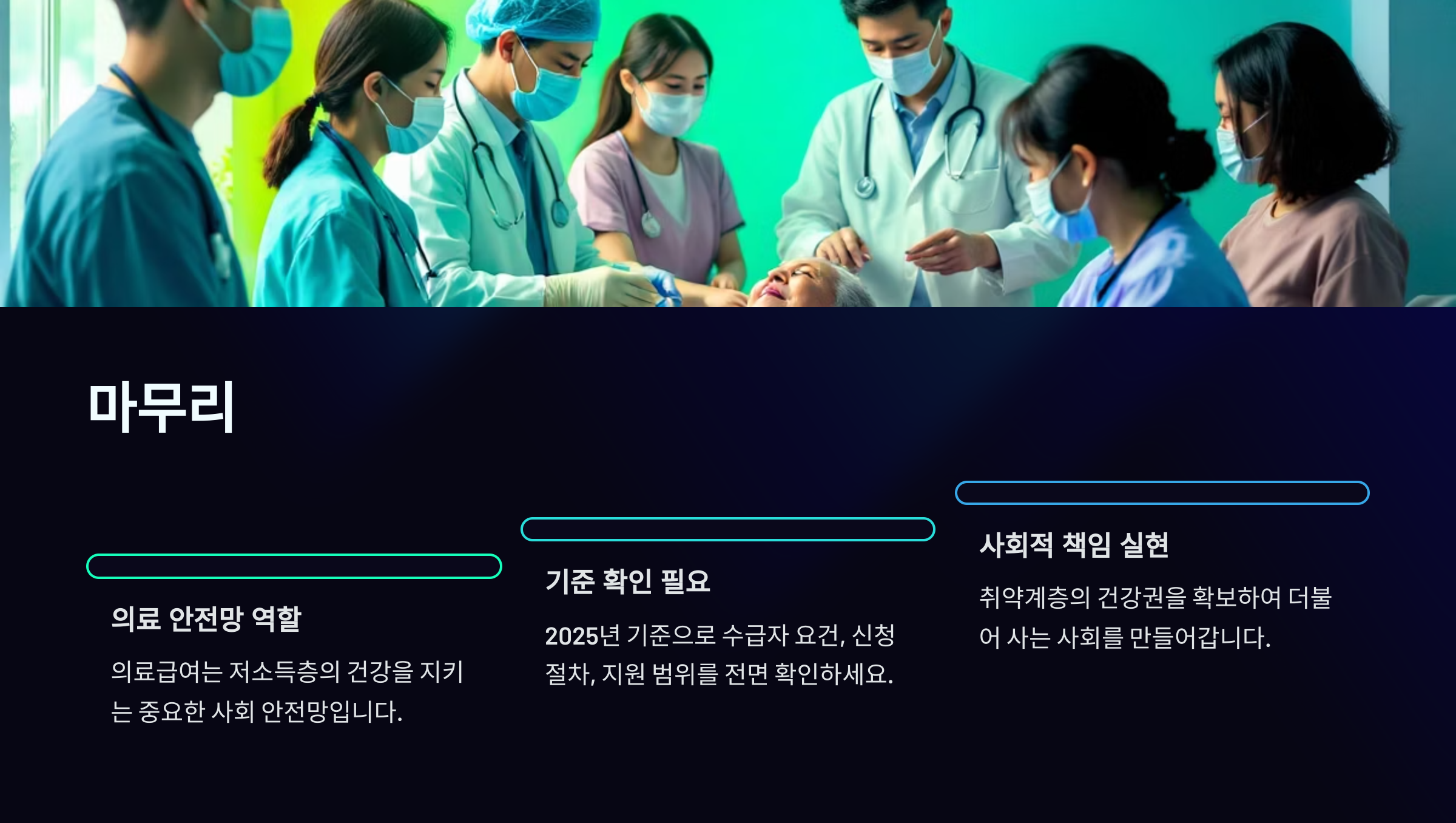 의료급여는 생활이 어려운 분들에게 꼭 필요한 의료보장 제도예요. 2025년에는 기준이 완화되고 절차가 간소화되어 더 많은 분들이 혜택을 받을 수 있게 되었어요. 하지만 여전히 복잡한 선정 기준과 절차 때문에 어려움을 겪는 경우가 많아요. 이 글에서 설명한 내용들을 참고해서 신청 자격을 확인해보시고, 필요하다면 전문가의 도움을 받아보세요.