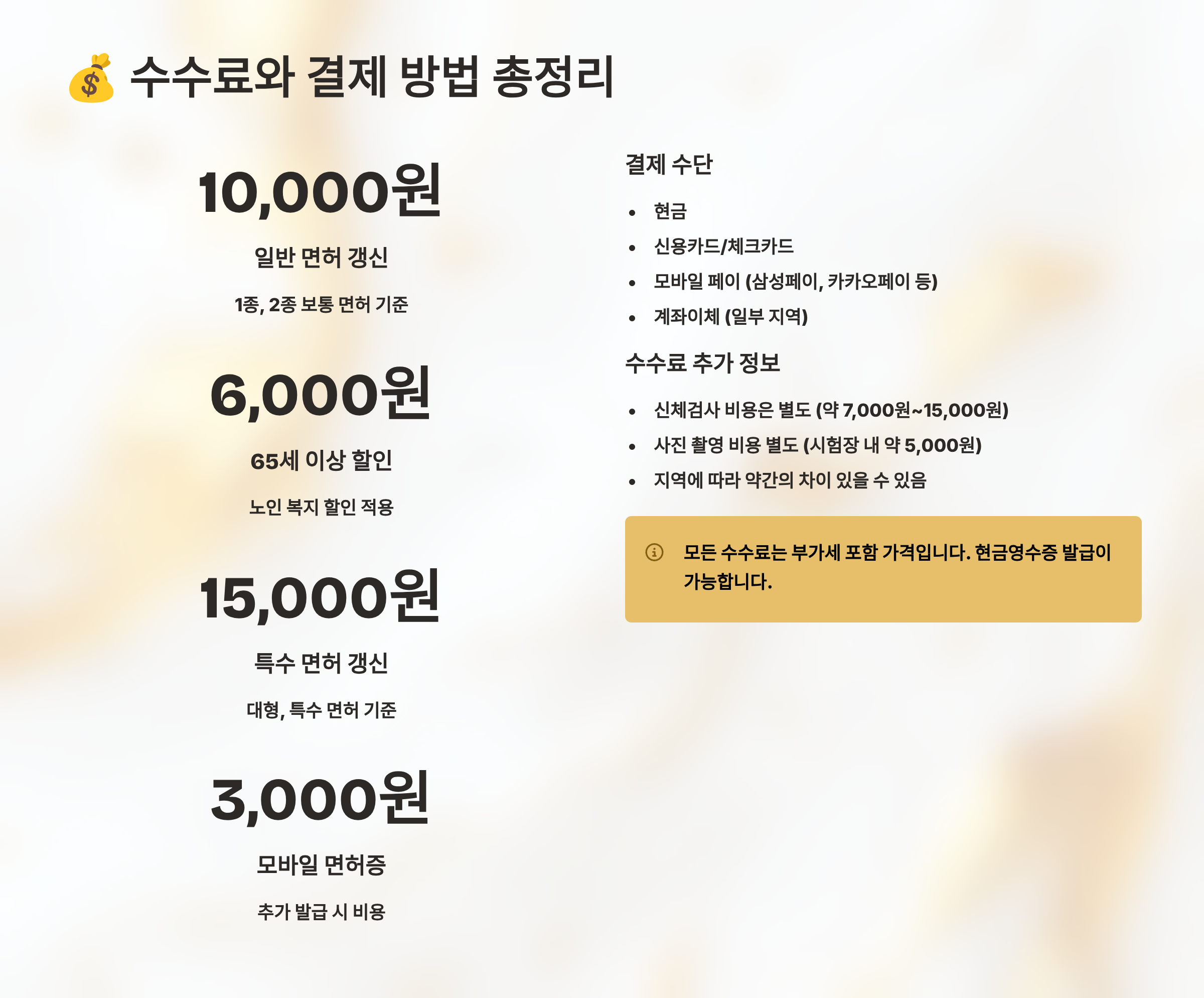 수수료 납부를 위한 현금이나 카드도 준비하세요. 운전면허시험장은 현금과 카드 모두 가능하지만, 경찰서는 현금만 받는 곳이 있어요. 수수료는 일반 갱신 25,000원, 적성검사 포함시 30,000원이에요. 온라인은 더 저렴해서 18,000원이랍니다.