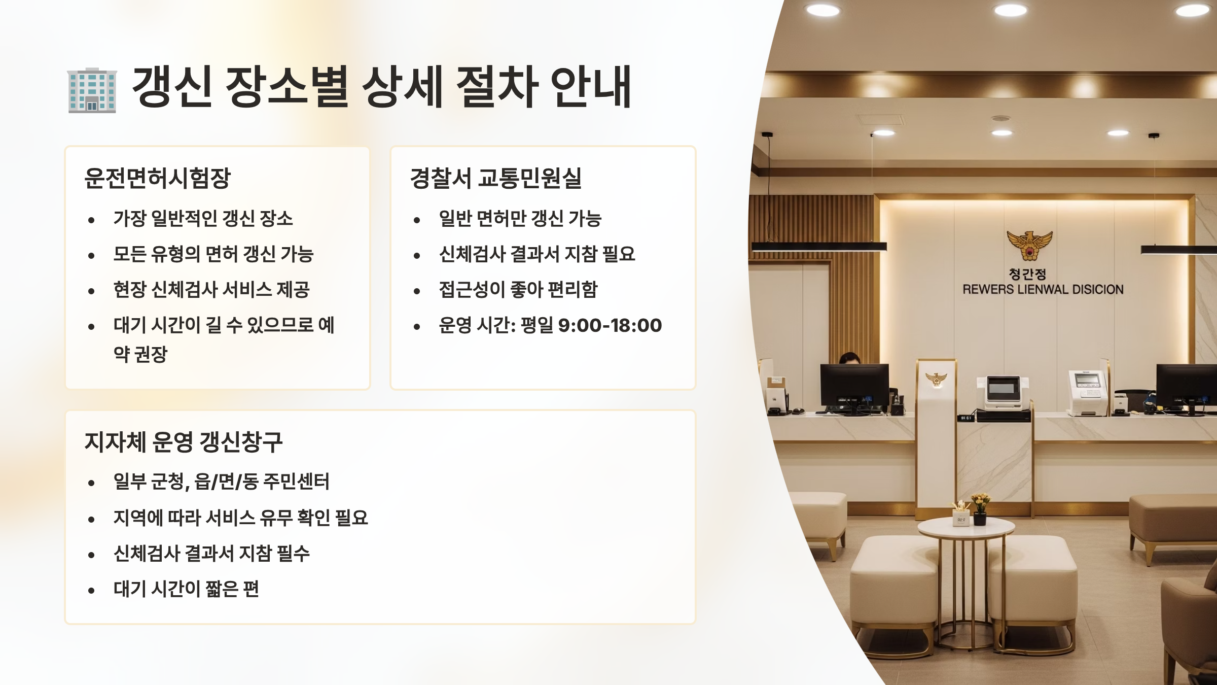 운전면허 갱신은 여러 장소에서 가능해요. 운전면허시험장, 경찰서, 온라인, 지정 병원 등 다양한 선택지가 있어서 본인에게 가장 편리한 방법을 선택하면 돼요. 각 장소마다 절차와 소요시간이 다르니 자세히 알아볼게요!