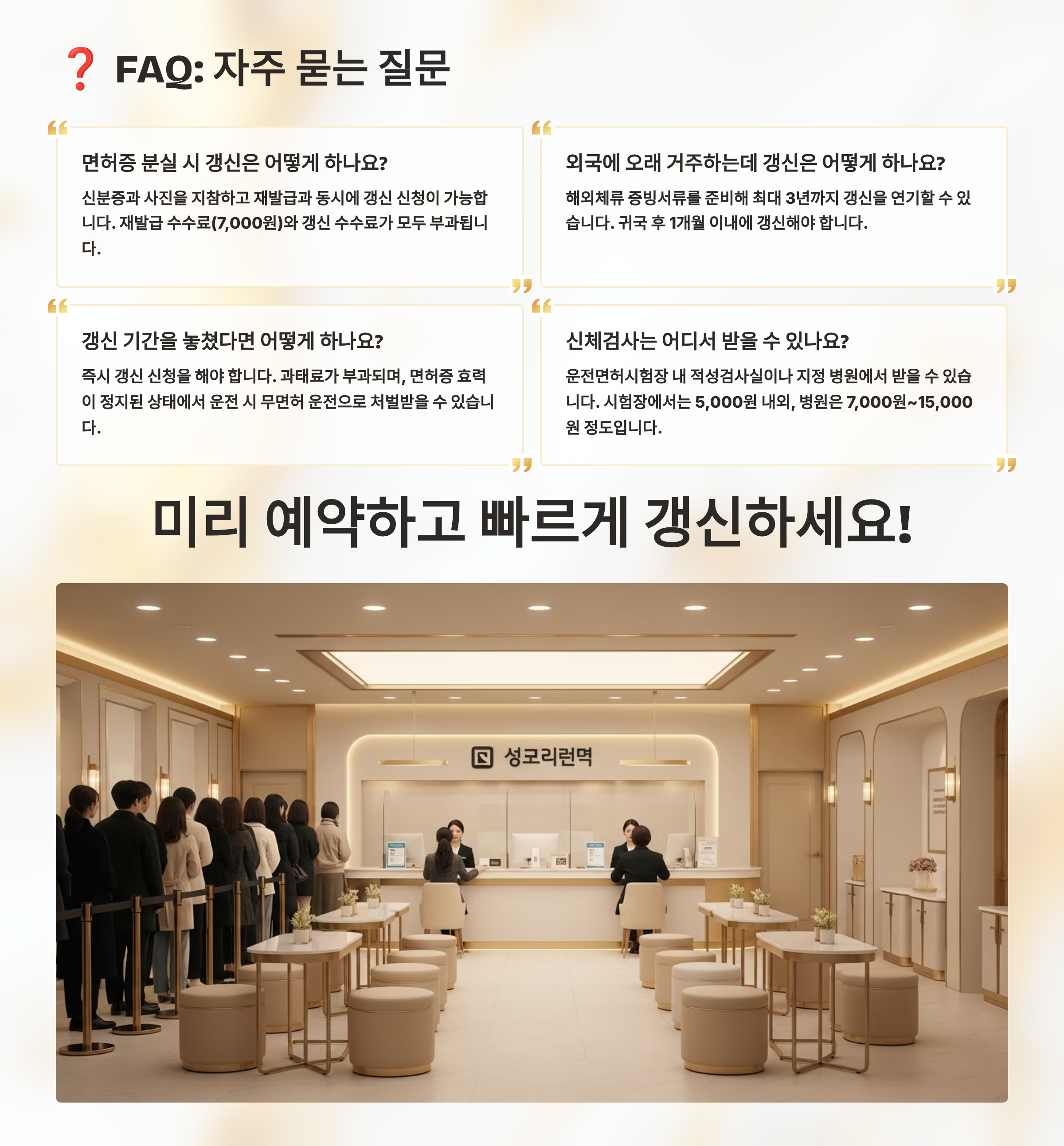 계절별로도 갱신 패턴이 달라요. 봄과 가을은 갱신하기 좋은 날씨라 사람이 많고, 여름 휴가철과 겨울 연말연시는 상대적으로 한가해요. 비 오는 날이나 추운 날은 방문객이 적어서 빠르게 처리할 수 있답니다! 📅