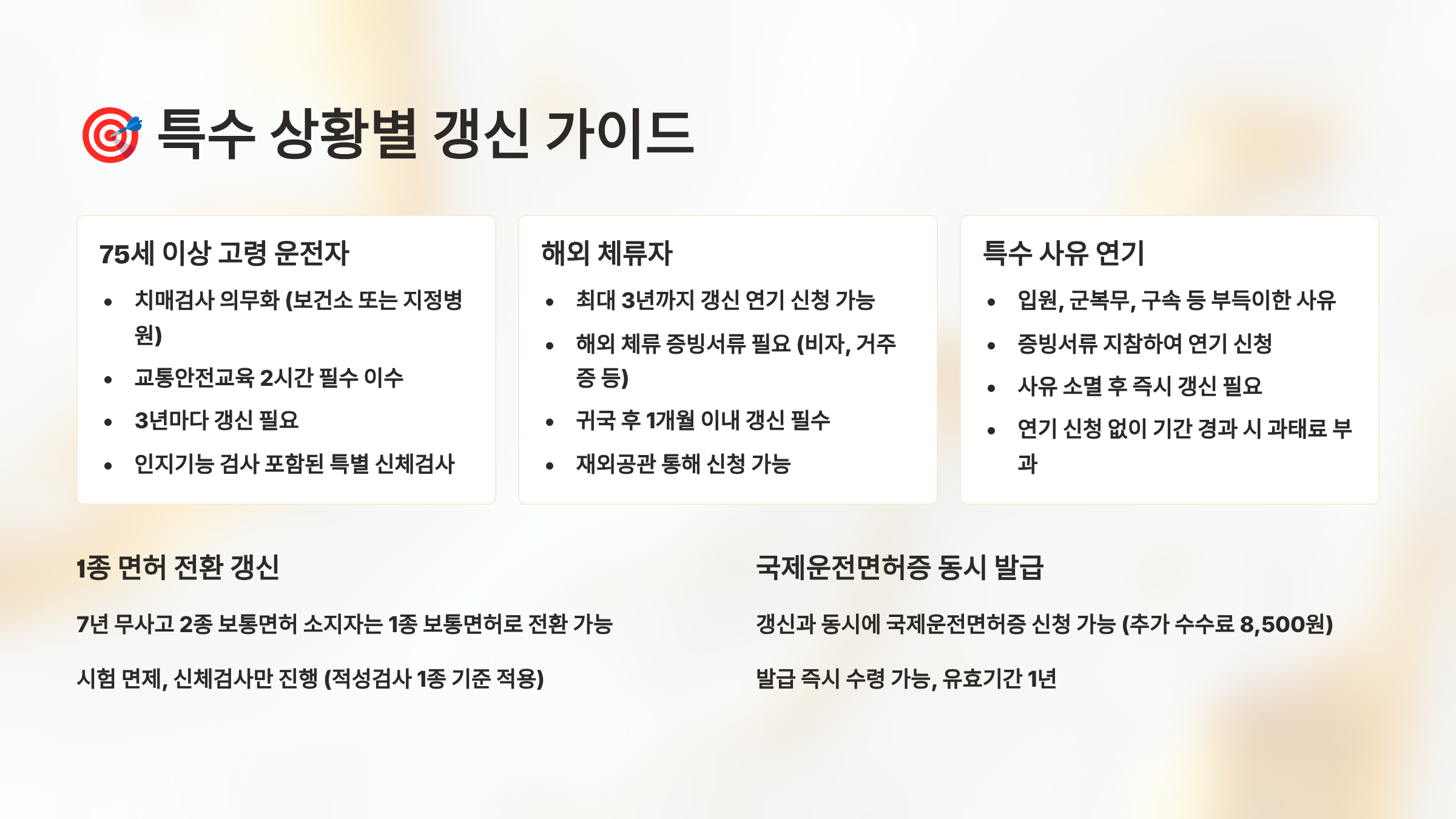 특수한 상황에 계신 분들도 포기하지 마세요. 해외 거주, 군 복무, 고령자 등 각자의 상황에 맞는 특례와 지원이 마련되어 있어요. 도로교통공단 콜센터(1577-1120)에 문의하면 친절한 상담을 받을 수 있답니다.