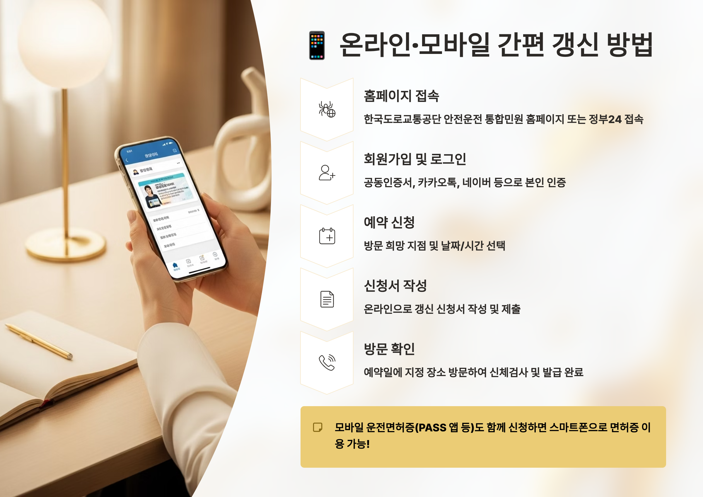 온라인 갱신이 가능한 조건이 있어요. 최근 2년 이내 국민건강보험공단 건강검진을 받은 기록이 있어야 하고, 벌점이 40점 미만이어야 해요. 또한 2종 보통면허나 65세 미만 1종 보통면허 소지자만 가능해요. 75세 이상은 교통안전교육을 이수해야 해서 온라인 갱신이 제한돼요.