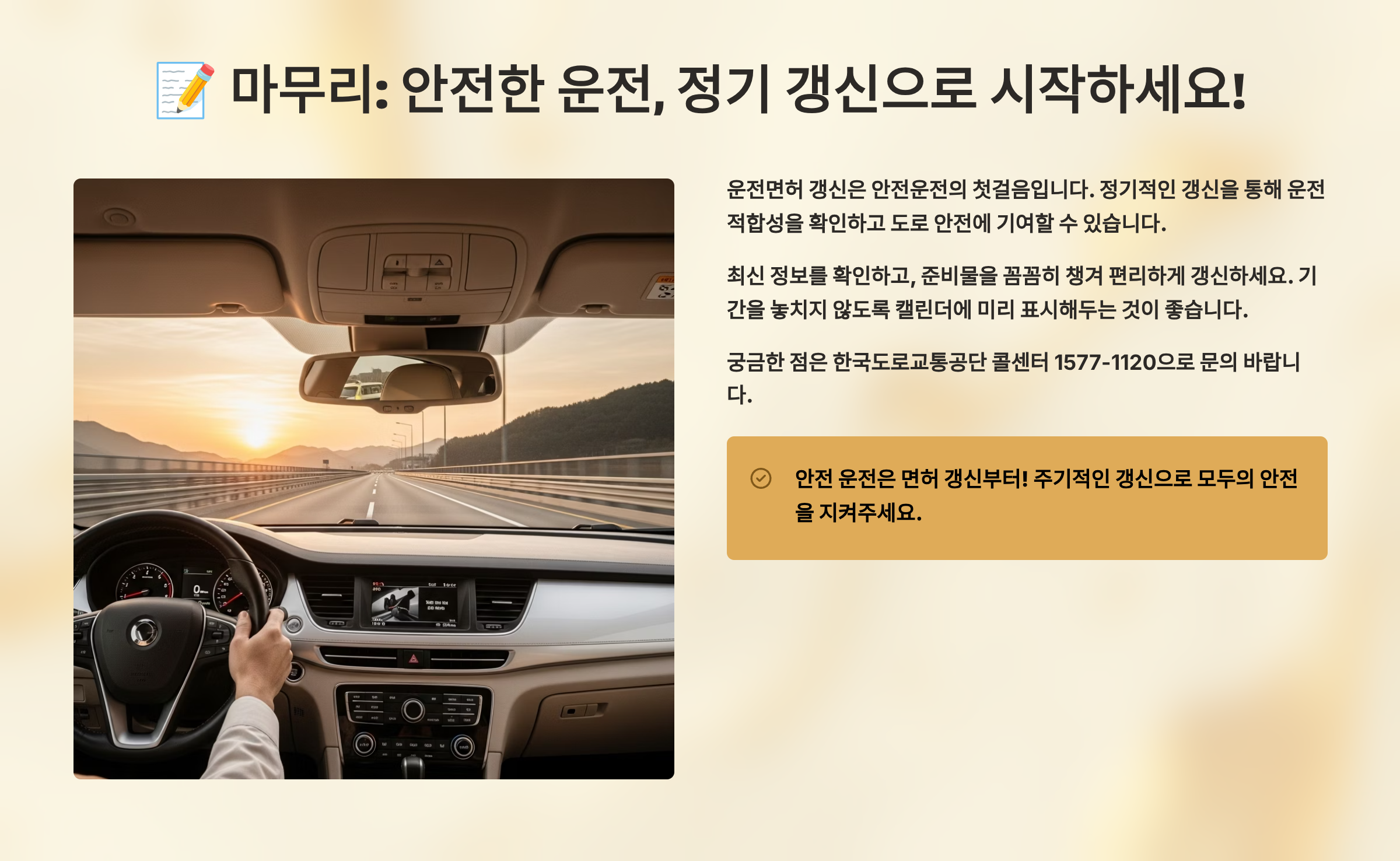본 글에서 제공하는 운전면허 갱신 관련 정보는 2025년 1월 기준이며, 관련 법규와 정책은 수시로 변경될 수 있습니다. 실제 갱신 시에는 도로교통공단 공식 홈페이지나 콜센터(1577-1120)를 통해 최신 정보를 확인하시기 바랍니다. 개인별 상황에 따라 필요 서류나 절차가 다를 수 있으니 사전 확인이 필요합니다.