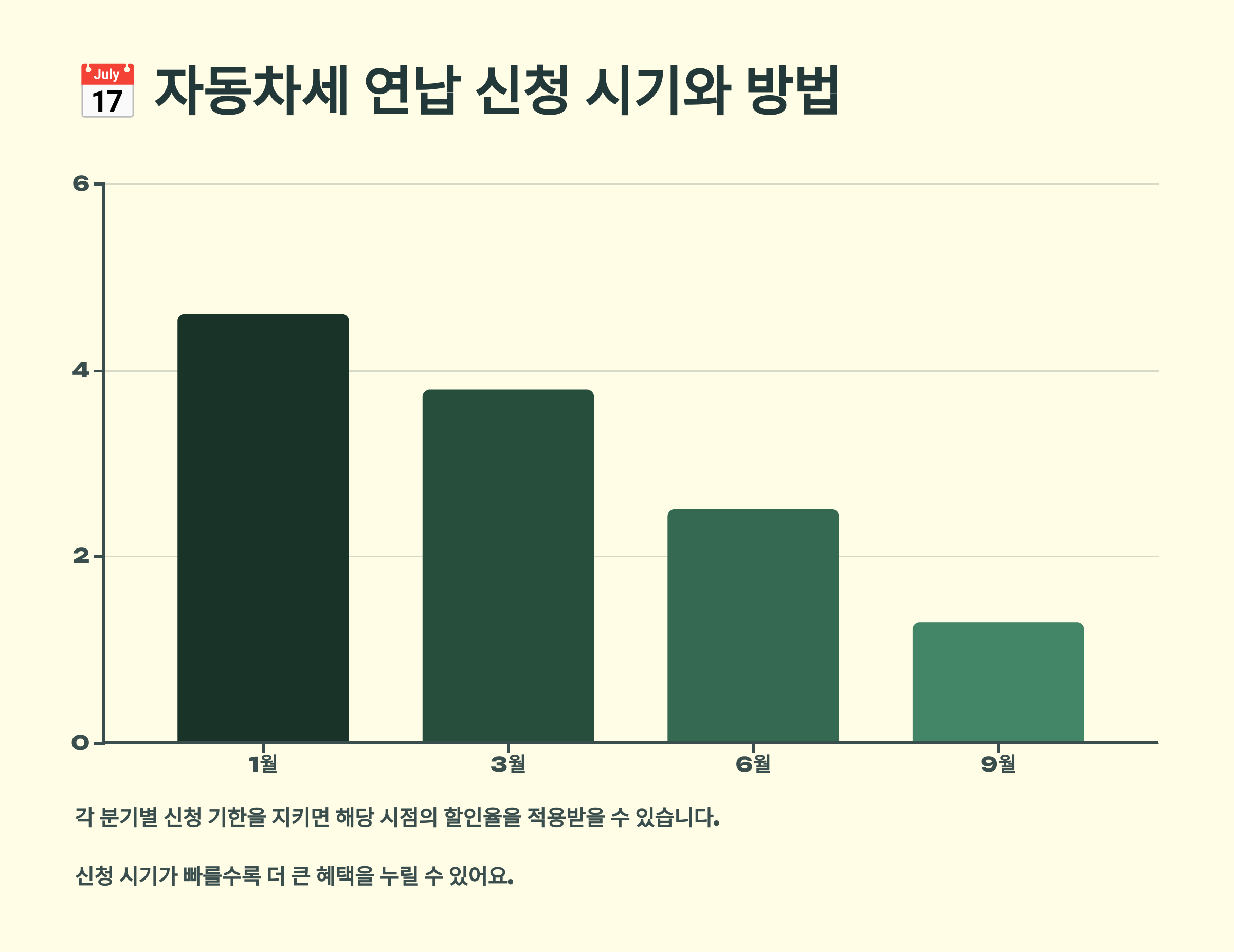 A1. 자동차세 연납은 1월, 3월, 6월, 9월에 신청 가능해요. 가장 높은 할인율(10%)을 받으려면 1월 16일부터 31일 사이에 신청하는 게 좋아요. 각 신청 기간은 보통 해당 월의 16일부터 말일까지예요. 놓쳤다고 너무 아쉬워하지 마시고 다음 신청 기간을 노려보세요!