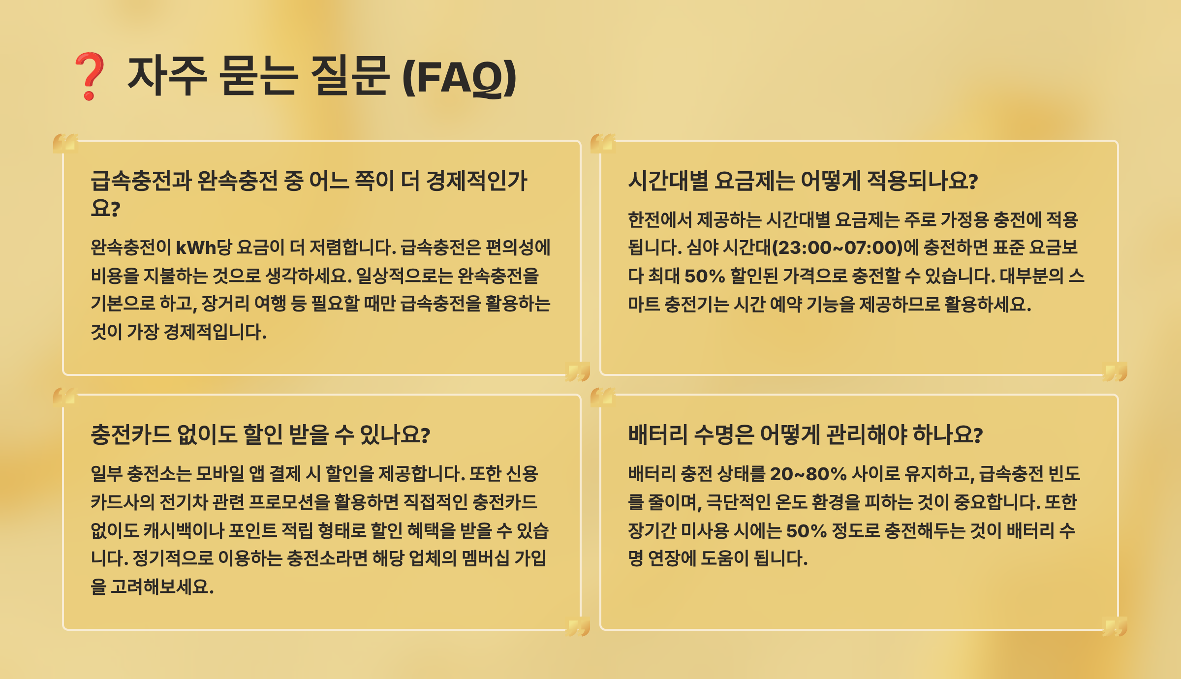 A1. 충전요금은 점진적으로 인상되고 있지만, 여전히 내연기관차 대비 50% 이하 수준이에요. 정부 지원정책과 인프라 확대로 당분간 경제성은 유지될 전망입니다.