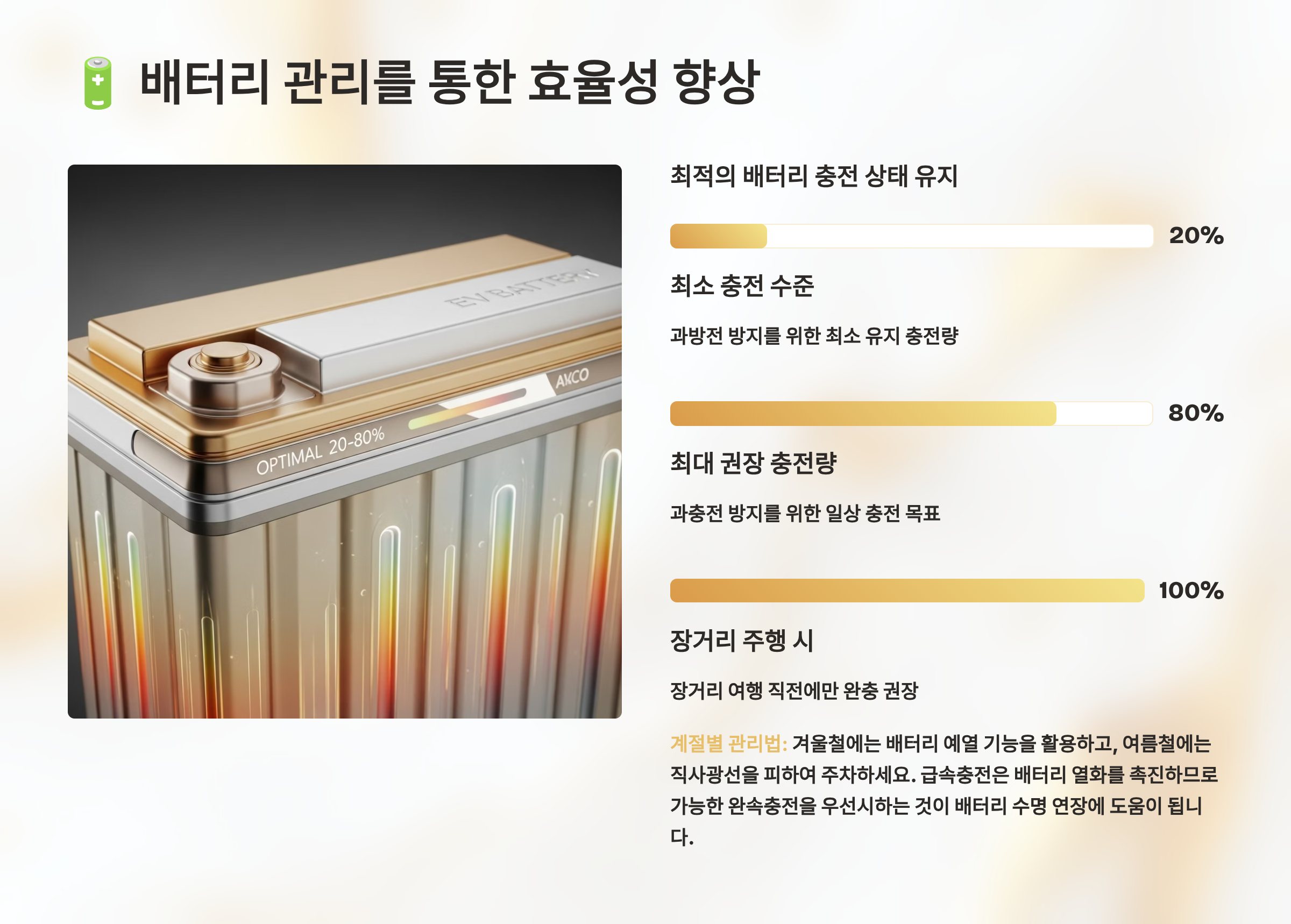 배터리 온도 관리도 중요해요! 여름철 고온이나 겨울철 저온에서는 배터리 효율이 떨어져요. 특히 겨울철에는 배터리 히팅 시스템이 작동하면서 추가 전력을 소모하죠. 가능하면 실내 주차장이나 지하 주차장을 이용해서 배터리 온도를 적정하게 유지하는 것이 좋아요.