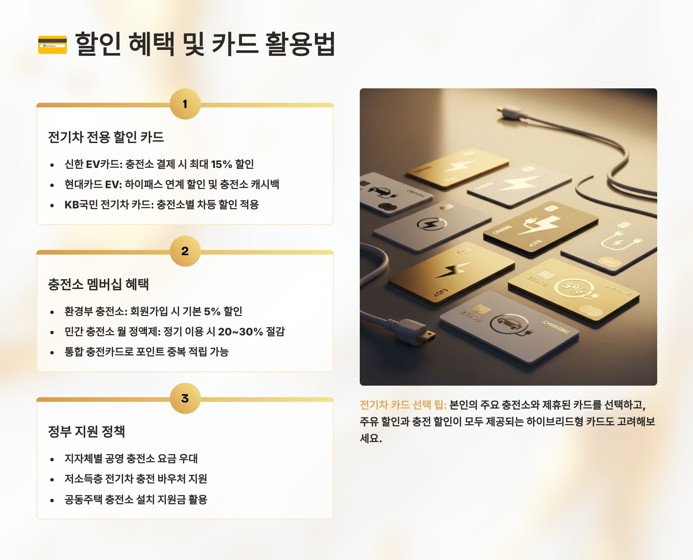 신용카드 할인 혜택도 놓치면 안 돼요! 신한 EV카드나 삼성 EV카드 같은 제휴카드를 활용하면 30~50%의 추가 할인을 받을 수 있어요. 월 5만원 충전시 최대 2만5천원까지 절약이 가능하답니다. 다만 전월 실적 조건이 있으니 기존 카드 혜택과 비교해서 발급받는 것이 좋아요.
