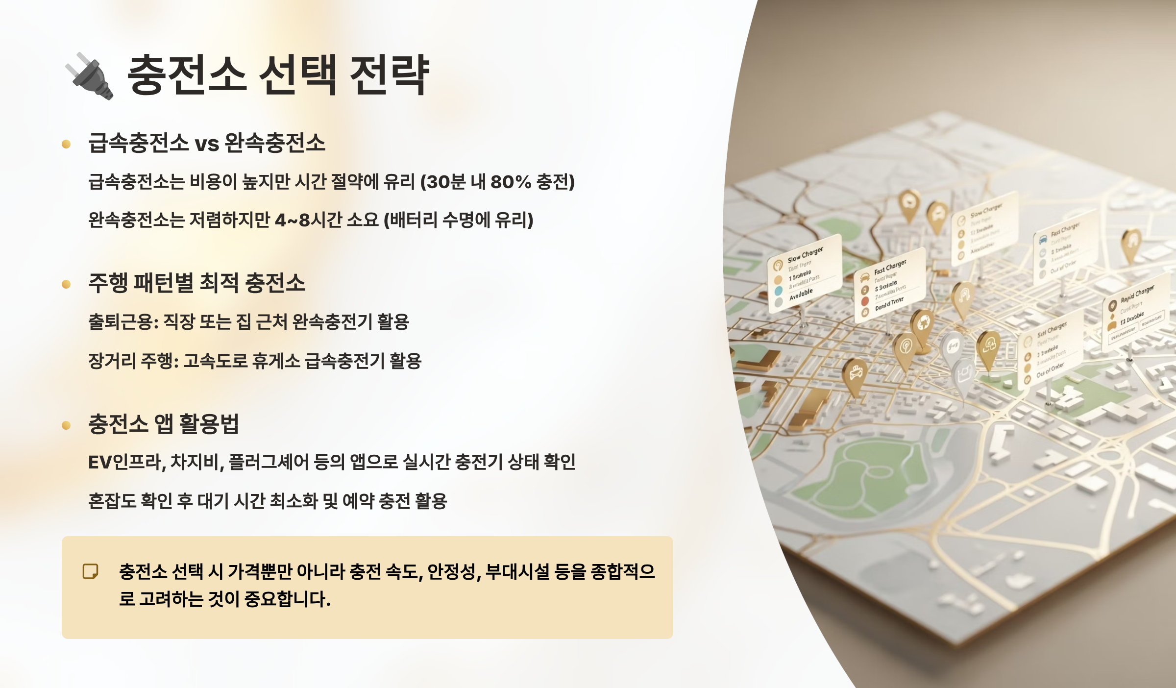 충전소 선택시 요금뿐만 아니라 충전 속도도 고려해야 해요. 급속충전기라도 50kW, 100kW, 350kW 등 다양한 속도가 있거든요. 시간이 급하다면 조금 비싸더라도 초급속 충전기를 사용하는 것이 효율적일 수 있어요. 반대로 시간 여유가 있다면 완속충전기를 사용해서 비용을 절약하는 것이 좋답니다! 🔌