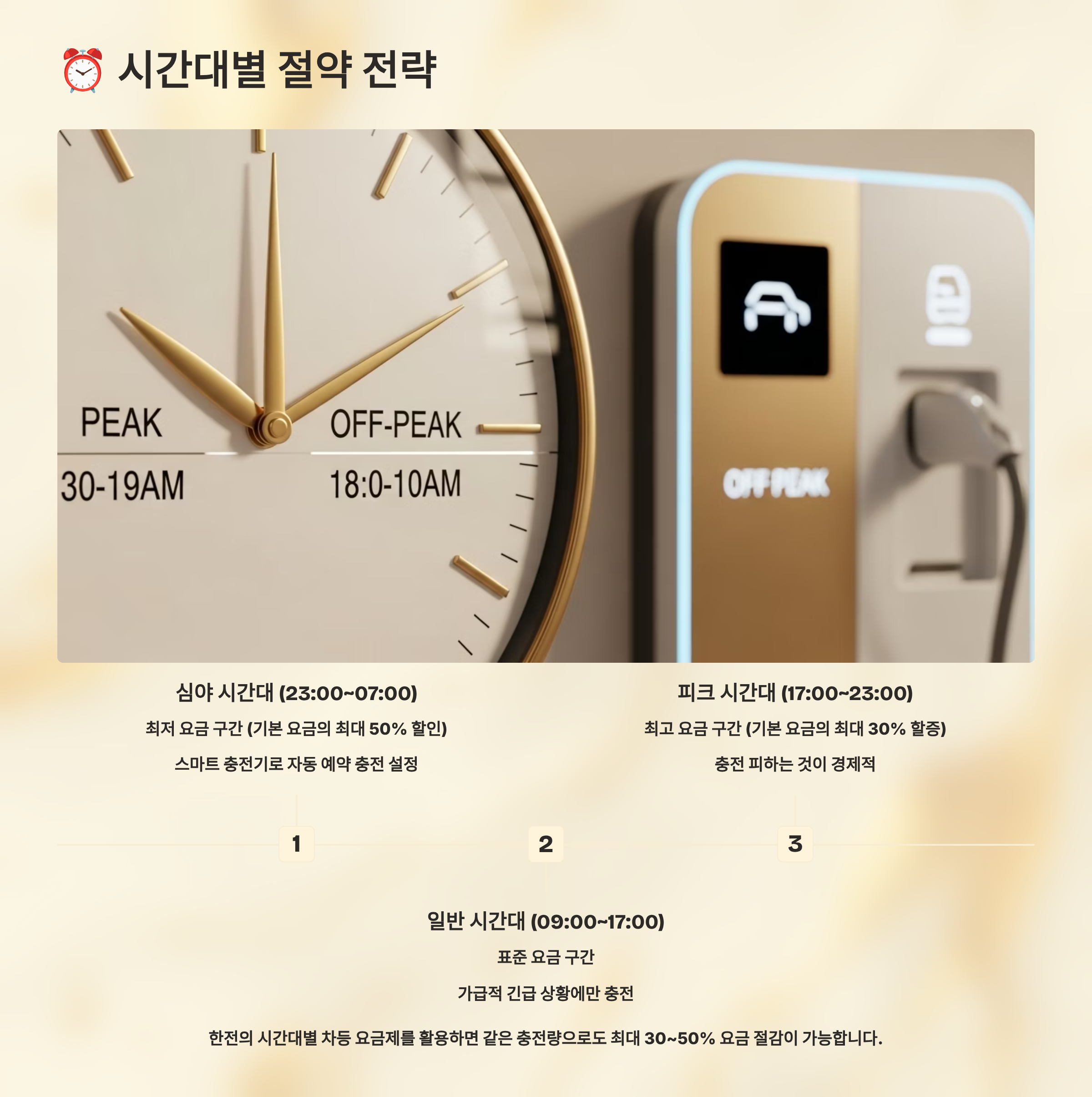 가정용 완속충전기를 이용할 경우 시간대별 요금 차이를 활용하면 엄청난 절약이 가능해요! 경부하 시간대(22:00~08:00)에는 kWh당 84.3원으로, 최대부하 시간대(259.2원)의 약 1/3 수준이랍니다. 이 차이를 활용하면 연간 충전비를 절반 이하로 줄일 수 있어요.