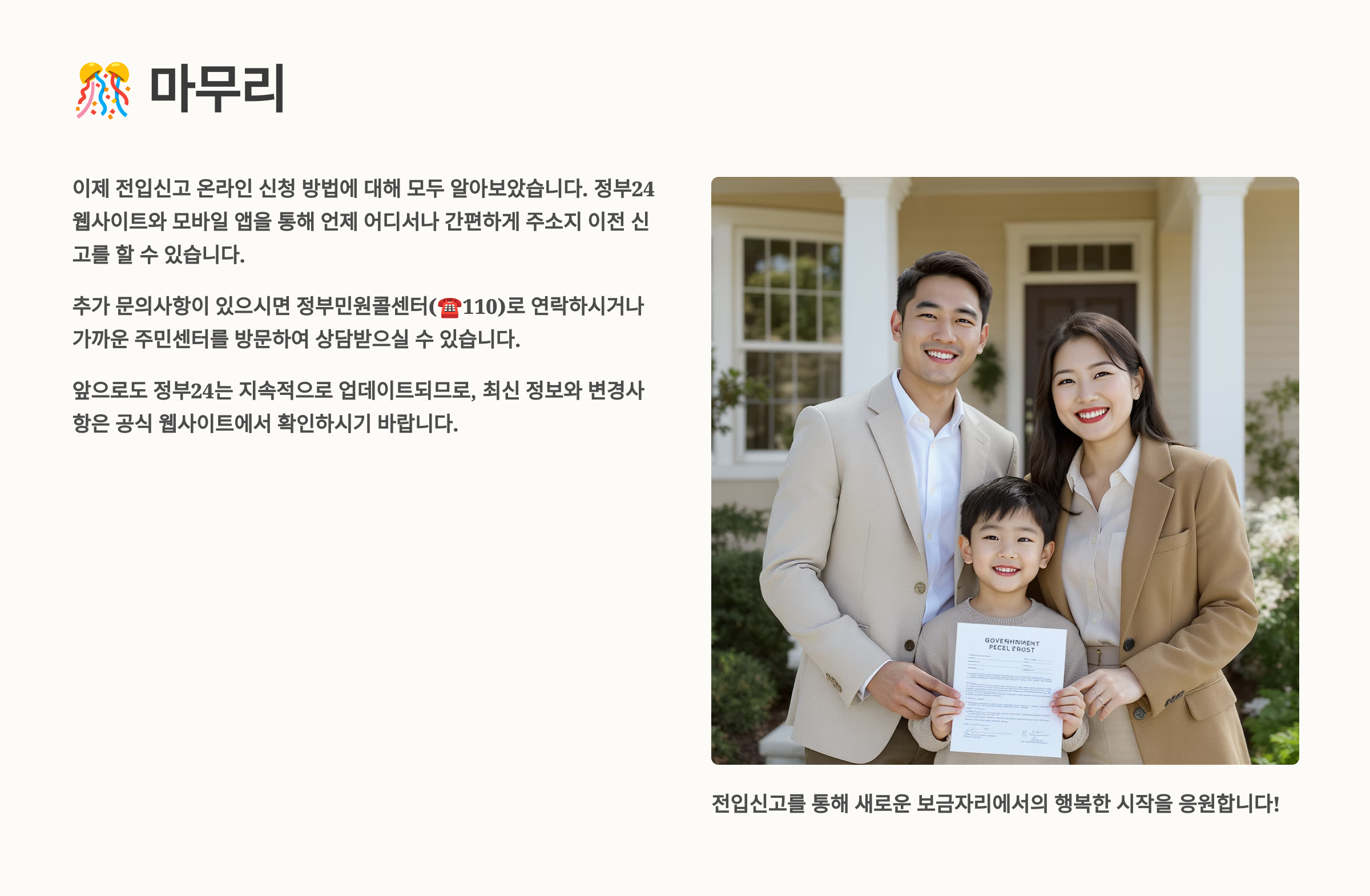 이사는 인생의 새로운 시작이에요. 새로운 환경에서 새로운 추억을 만들어갈 여러분을 응원합니다! 전입신고는 그 시작을 알리는 첫 단계인 만큼, 이 글을 통해 쉽고 빠르게 처리하시길 바라요. 혹시 전입신고 과정에서 어려움이 있다면 주저하지 말고 정부24 고객센터나 주민센터에 문의하세요. 친절한 상담을 통해 도움을 받을 수 있을 거예요.