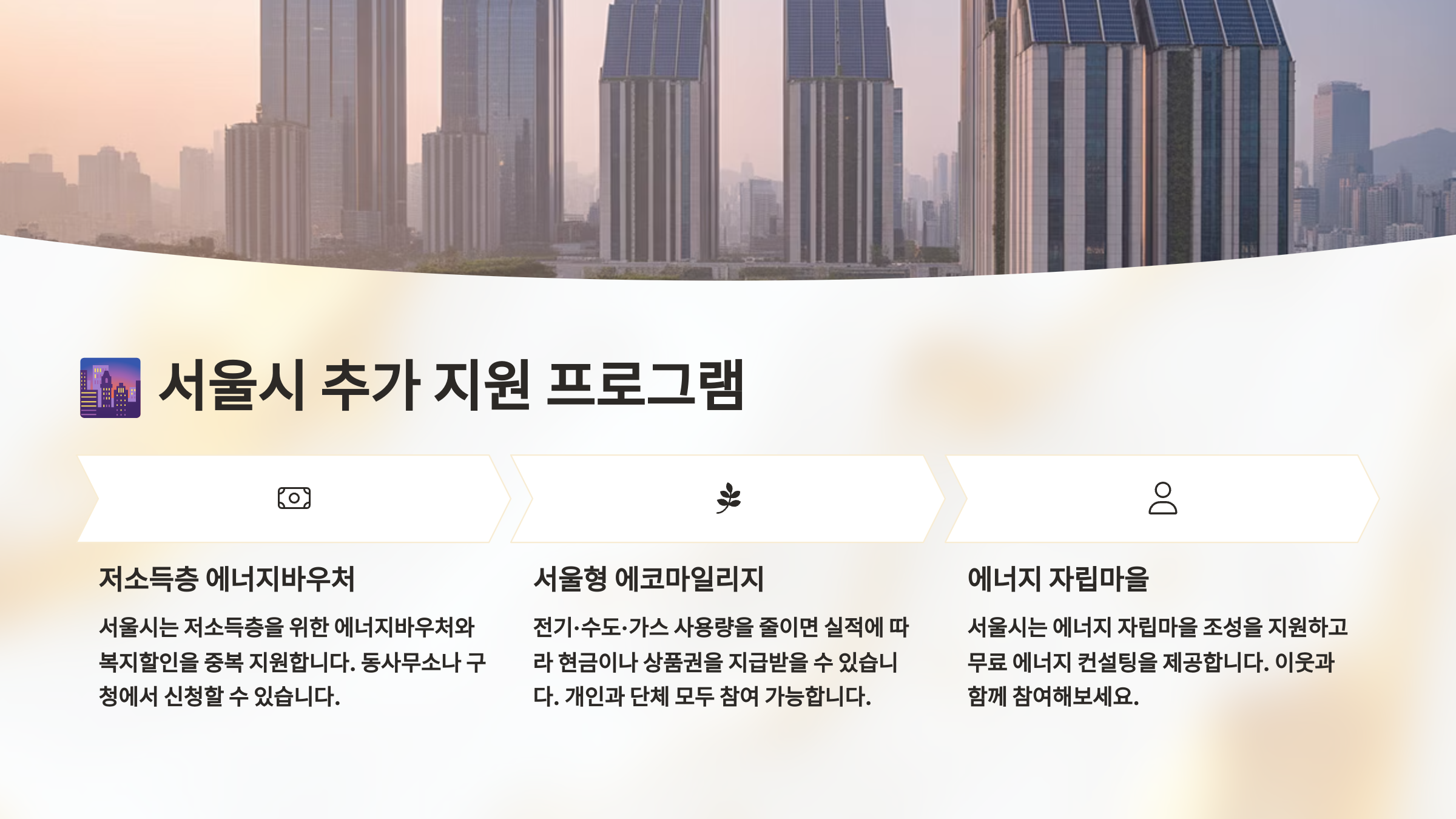 서울시에서는 정부 프로그램에 더해 추가적인 에너지 절약 지원책을 운영하고 있어요. 대표적인 것이 '태양광 미니발전소' 지원 사업인데, 베란다나 옥상에 소규모 태양광 패널을 설치하면 설치비의 50-70%를 지원해준답니다. 월평균 3-5만원의 전기요금을 절약할 수 있어 투자 대비 효과가 정말 좋아요! ☀️