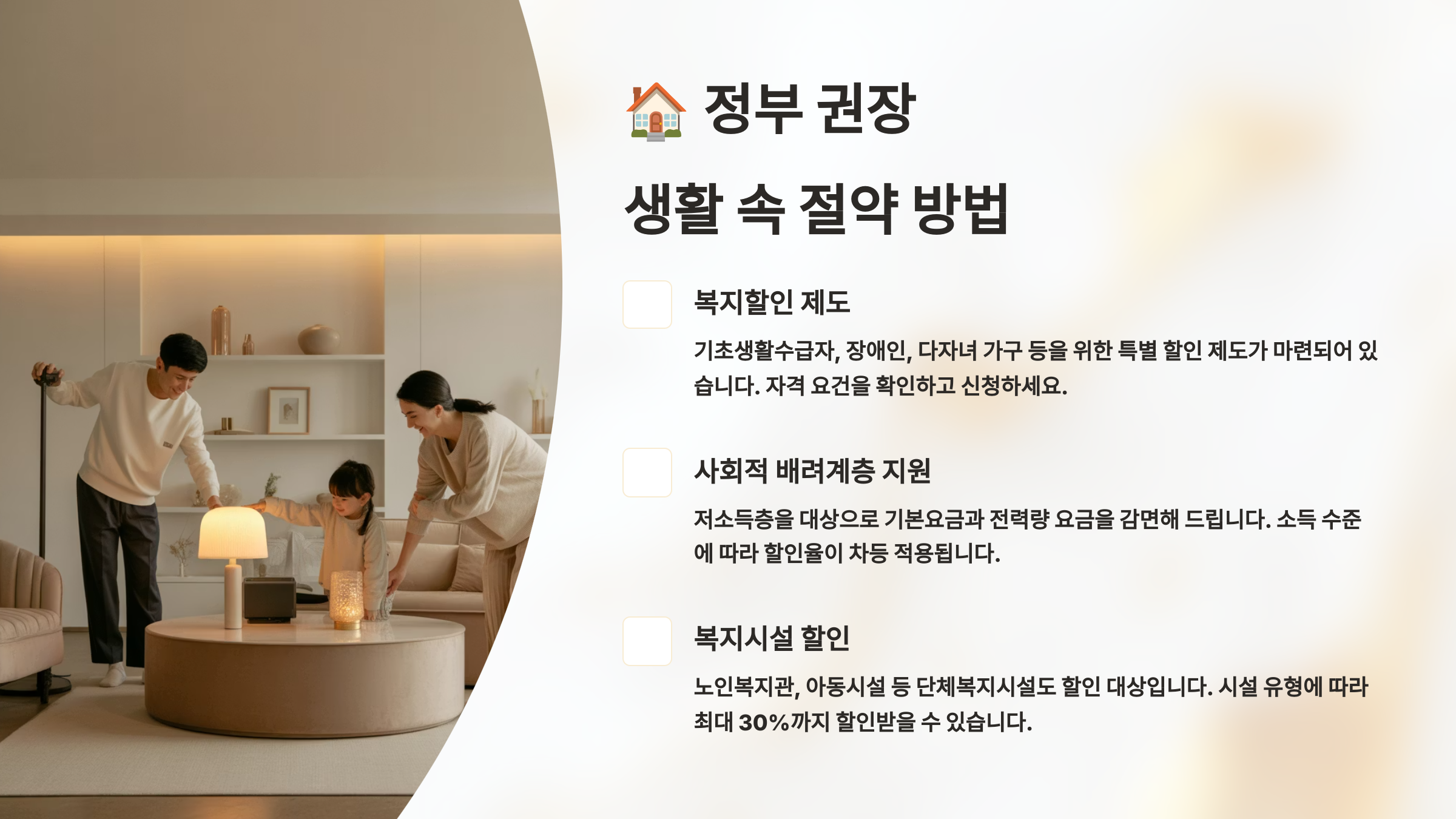 기초생활수급자와 차상위계층을 위한 할인도 상당해요. 생계·의료급여 수급자는 월 16,000원, 주거·교육급여 수급자는 월 10,000원, 차상위계층은 월 8,000원까지 할인받을 수 있어요. 여름철과 겨울철에는 추가 할인도 적용되는데, 7-8월과 12-2월에는 각각 20% 추가 할인이 적용돼 냉난방비 부담을 덜어준답니다.