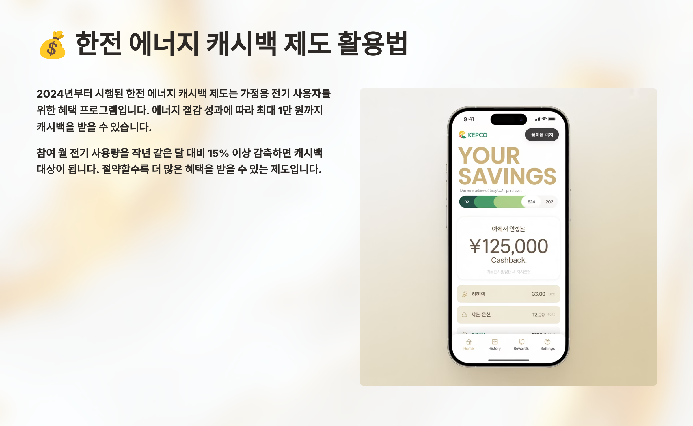 | 절감률 | 캐시백 단가 | 월 100kWh 절감 시 | 연간 예상 캐시백 |