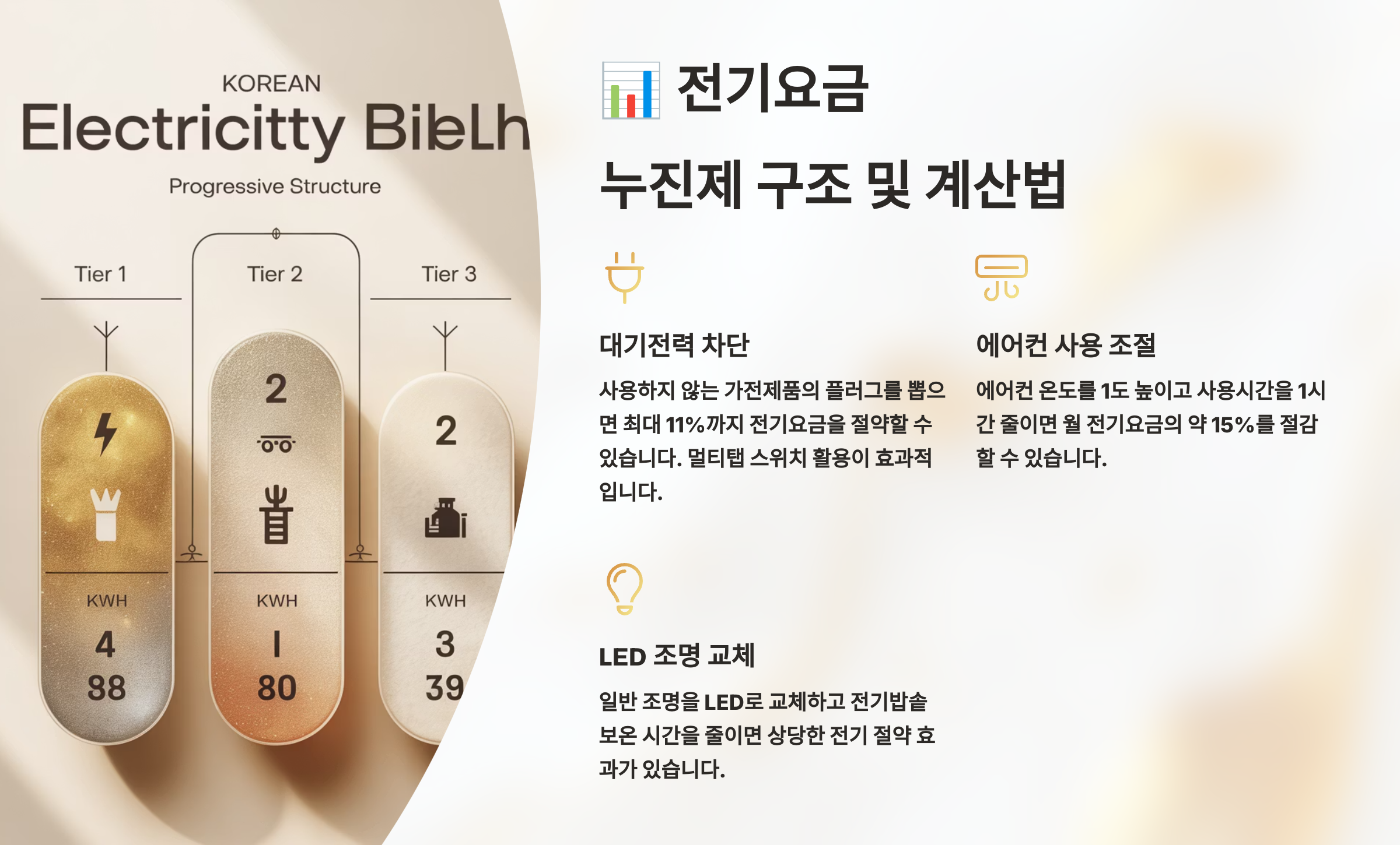 전기요금 누진제를 정확히 이해하면 요금 폭탄을 피할 수 있어요. 현행 전기요금 누진제는 3단계로 구성되어 있는데, 1단계는 0~200kWh로 약 110원/kWh, 2단계는 201~400kWh로 약 210원/kWh, 3단계는 401kWh 초과분에 대해 약 300원/kWh가 적용돼요. 사용량이 많아질수록 요금이 급격히 증가하는 구조랍니다! 📈