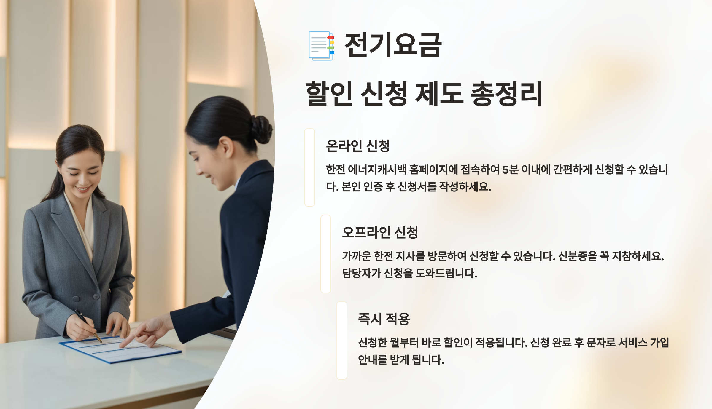 신청 방법도 정말 간단해졌어요. 한전 고객센터(국번 없이 123)로 전화하거나 KEPCO 사이버지점(cyber.kepco.co.kr)에서 온라인으로 신청할 수 있어요. 필요 서류는 주민등록등본과 자격 증명서류(수급자 증명서, 장애인 증명서 등)만 있으면 돼요. 온라인 신청 시 서류를 스캔해서 업로드하면 되니 집에서 편하게 신청할 수 있답니다! 📱