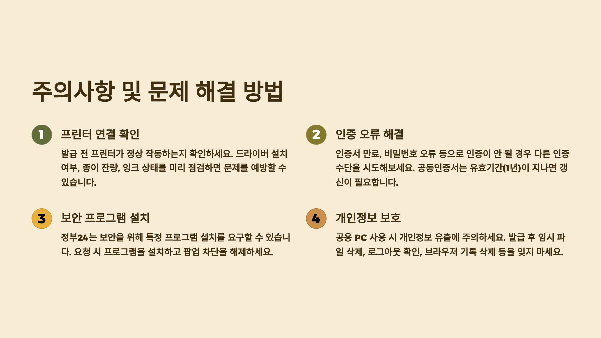 처음에는 복잡해 보일 수 있지만 한 번만 해보면 정말 쉬워요. 회원가입부터 로그인, 발급, 출력까지 모든 과정이 직관적으로 설계되어 있어서 누구나 쉽게 이용할 수 있답니다. 특히 간편인증을 사용하면 더욱 빠르고 안전하게 서비스를 이용할 수 있어요.