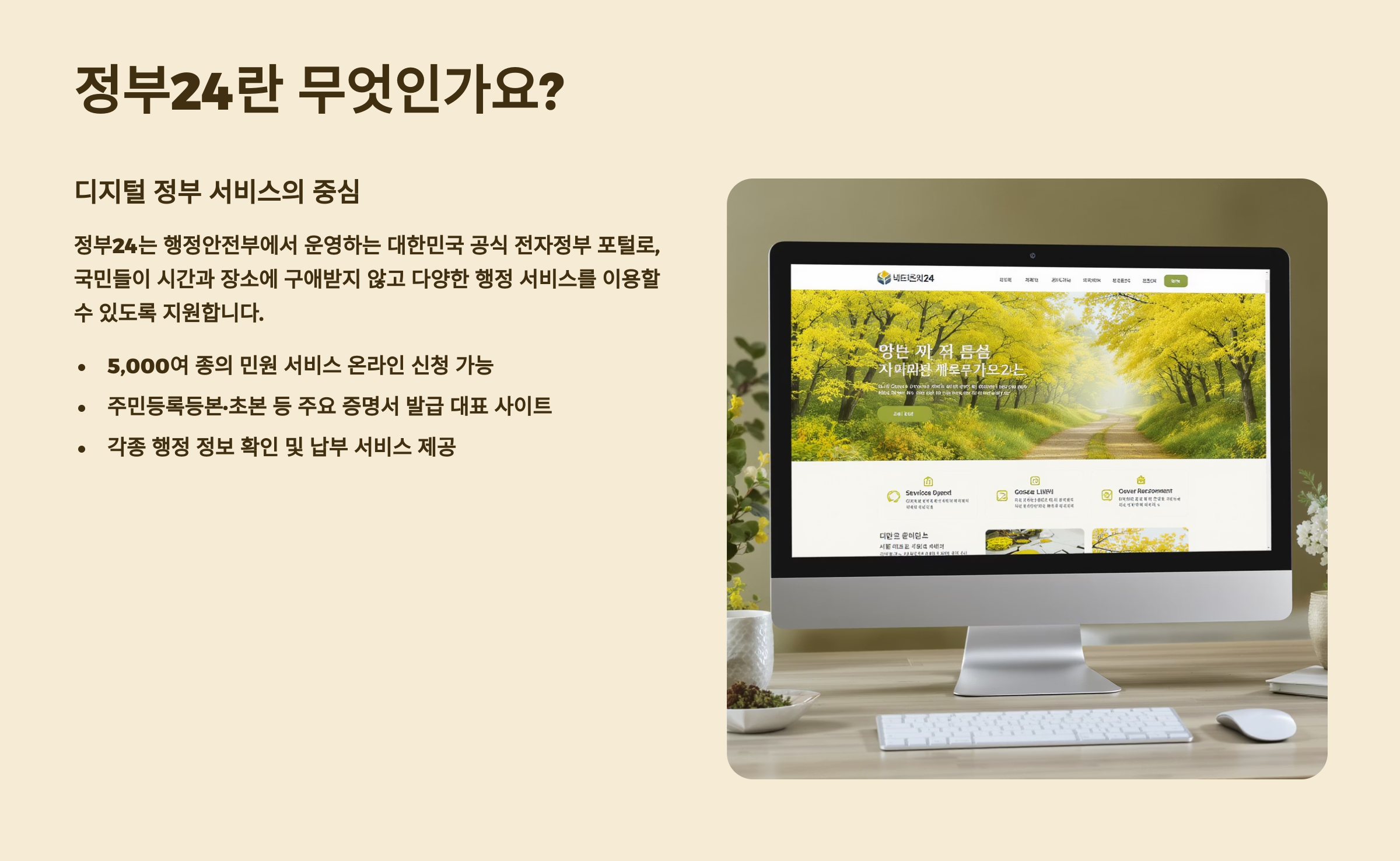 정부24는 대한민국 정부에서 운영하는 통합 민원 서비스 포털이에요. 2017년 7월에 기존의 민원24가 정부24로 새롭게 태어났답니다. 이곳에서는 주민등록등본뿐만 아니라 다양한 정부 서비스를 한 곳에서 이용할 수 있어요. 무려 5,000여 종의 민원 서비스를 제공하고 있다니 정말 대단하죠? 🏛️