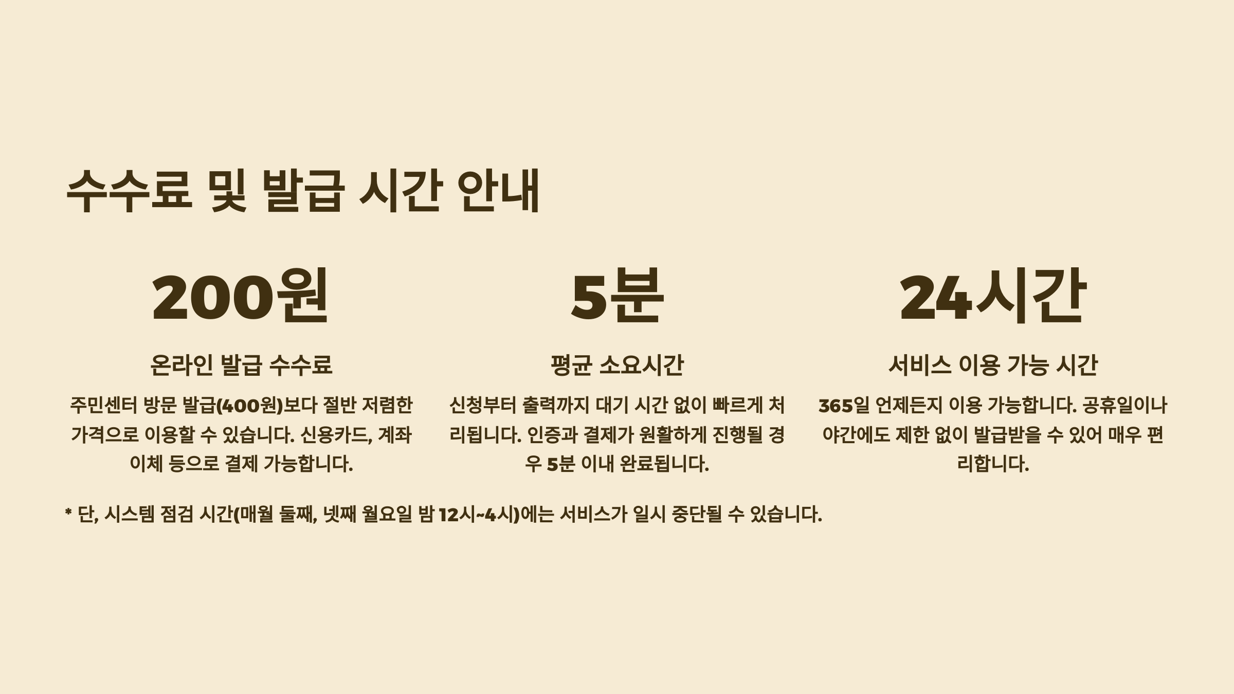 무엇보다 비용 절감 효과가 크죠! 방문 발급은 건당 400원이지만 온라인은 무료예요. 1년에 몇 번만 이용해도 교통비와 시간, 수수료를 크게 절약할 수 있어요. 게다가 24시간 이용 가능하니 급하게 서류가 필요할 때도 걱정 없답니다! 💰