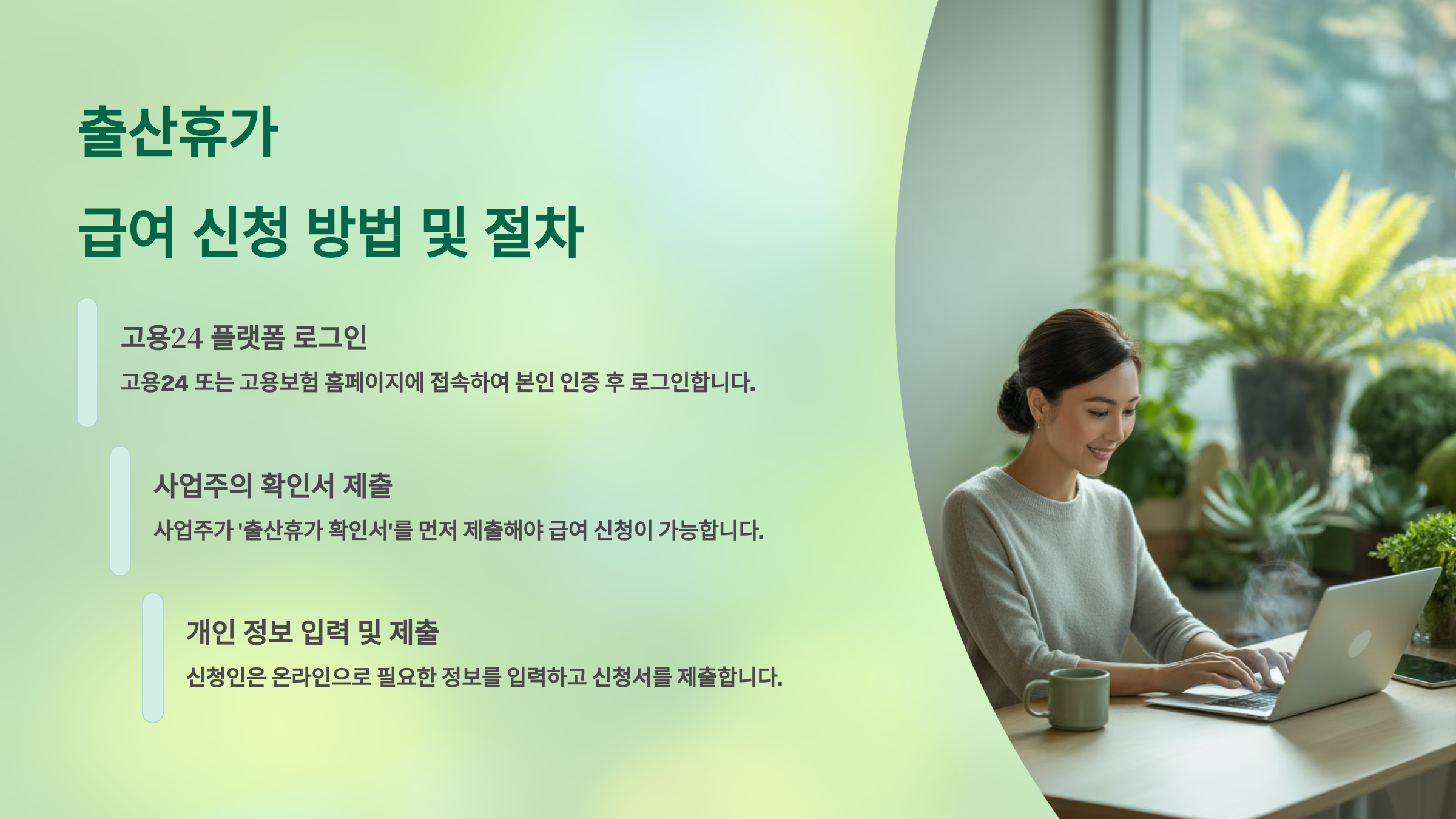 신청 절차를 단계별로 정리하면, 먼저 회사에서 출산전후휴가 확인서를 고용센터에 제출해야 해요. 이건 근로자가 아닌 사업주가 해야 하는 일이니, 휴가 시작 전에 인사팀에 미리 요청해두세요. 그다음 근로자가 직접 급여를 신청하는데, 온라인의 경우 확인서가 이미 등록되어 있으면 바로 선택해서 진행할 수 있어요.