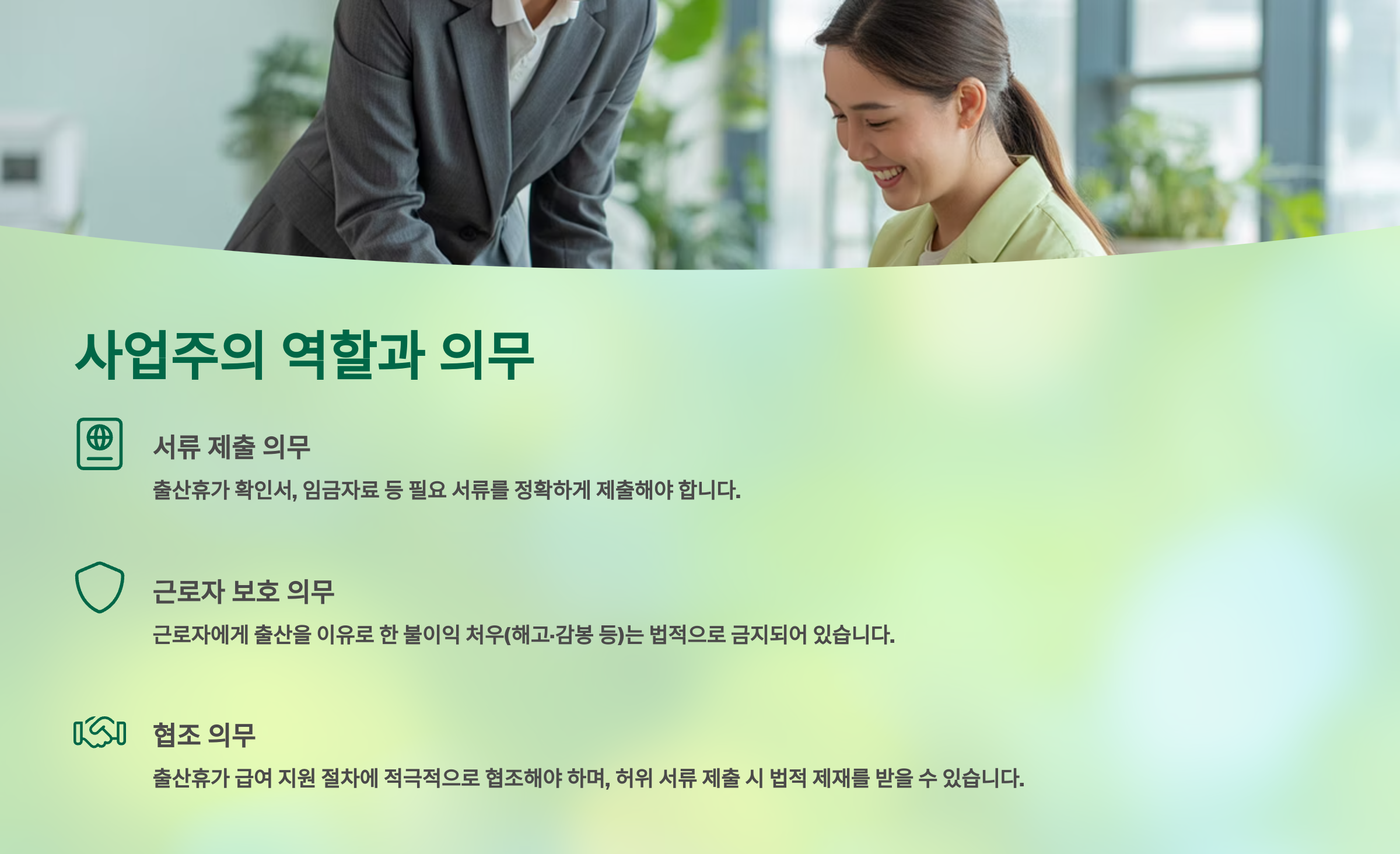 사업주가 알아야 할 중요한 사실이 하나 더 있어요. 출산휴가 기간 중에는 근로자를 해고할 수 없어요! 이는 모성보호법에 명시된 내용인데, 휴가 기간과 그 후 30일까지는 해고가 금지돼요. 만약 이를 위반하면 형사처벌까지 받을 수 있으니 주의해야 해요. 경영상 어려움이 있더라도 출산휴가 중인 근로자는 보호받아야 해요.