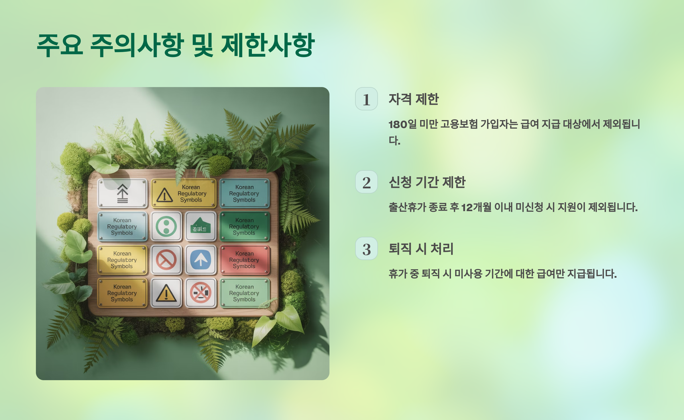 출산휴가 급여를 받는 데는 몇 가지 제한사항이 있어요. 가장 중요한 것은 휴가 기간 중에 다른 일을 하면 안 된다는 거예요. 주 15시간 이상 일하거나 월 150만원 이상의 소득이 발생하면 급여가 중단돼요. 이는 출산휴가의 목적이 산모의 건강 회복과 신생아 돌봄이기 때문이에요. 실제로 휴가 중에 재택근무를 하다가 적발된 사례도 있으니 주의하세요!