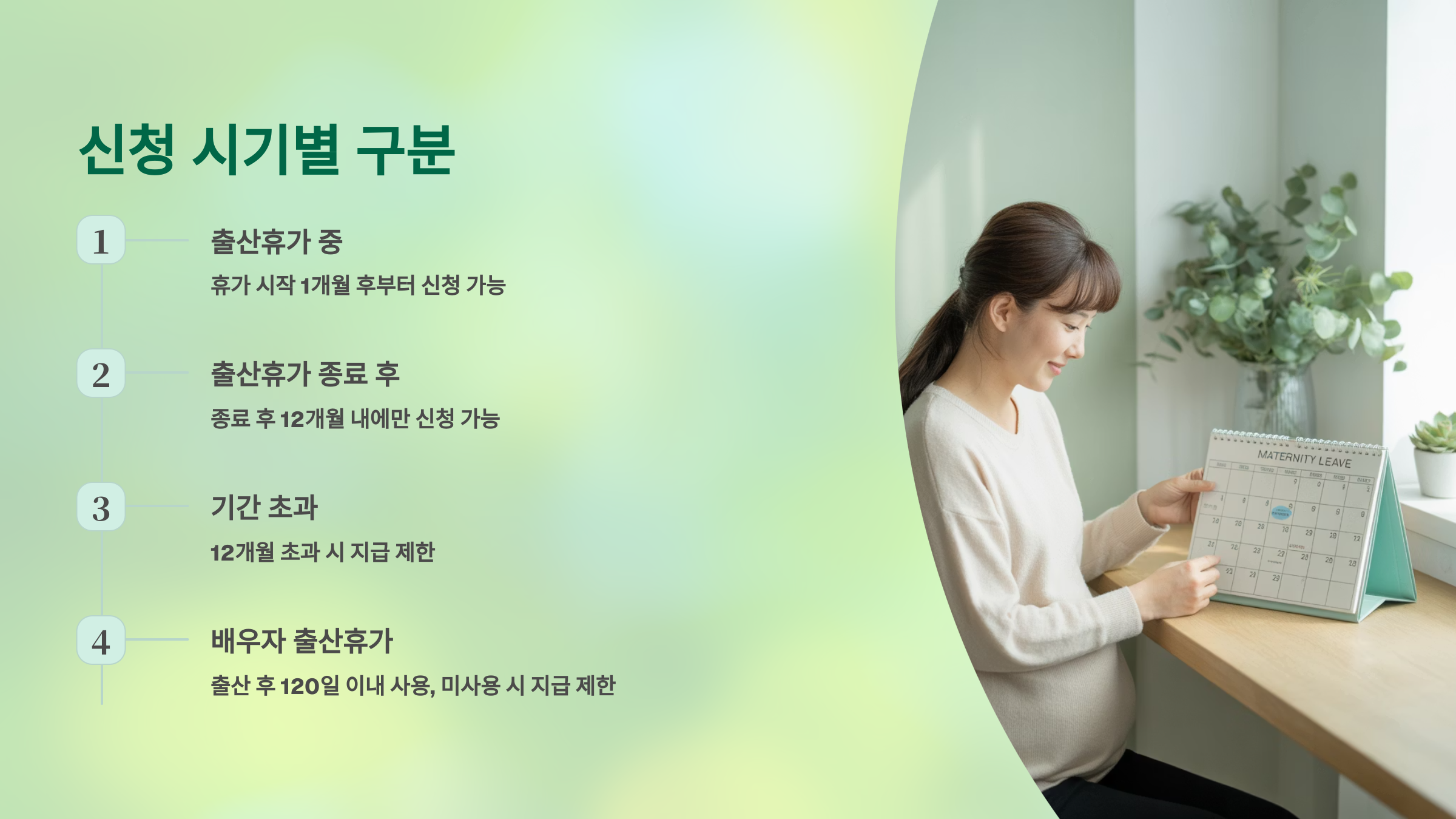 신청 시기도 중요한데, 휴가를 시작한 날 이후 1개월부터 휴가가 끝난 날 이후 12개월 이내에 신청해야 해요. 이 기간을 놓치면 급여를 받을 수 없으니 꼭 기억해두세요! 특히 출산 후에는 육아로 바빠서 깜빡하기 쉬운데, 미리 달력에 표시해두거나 알람을 설정해두는 것도 좋은 방법이에요.