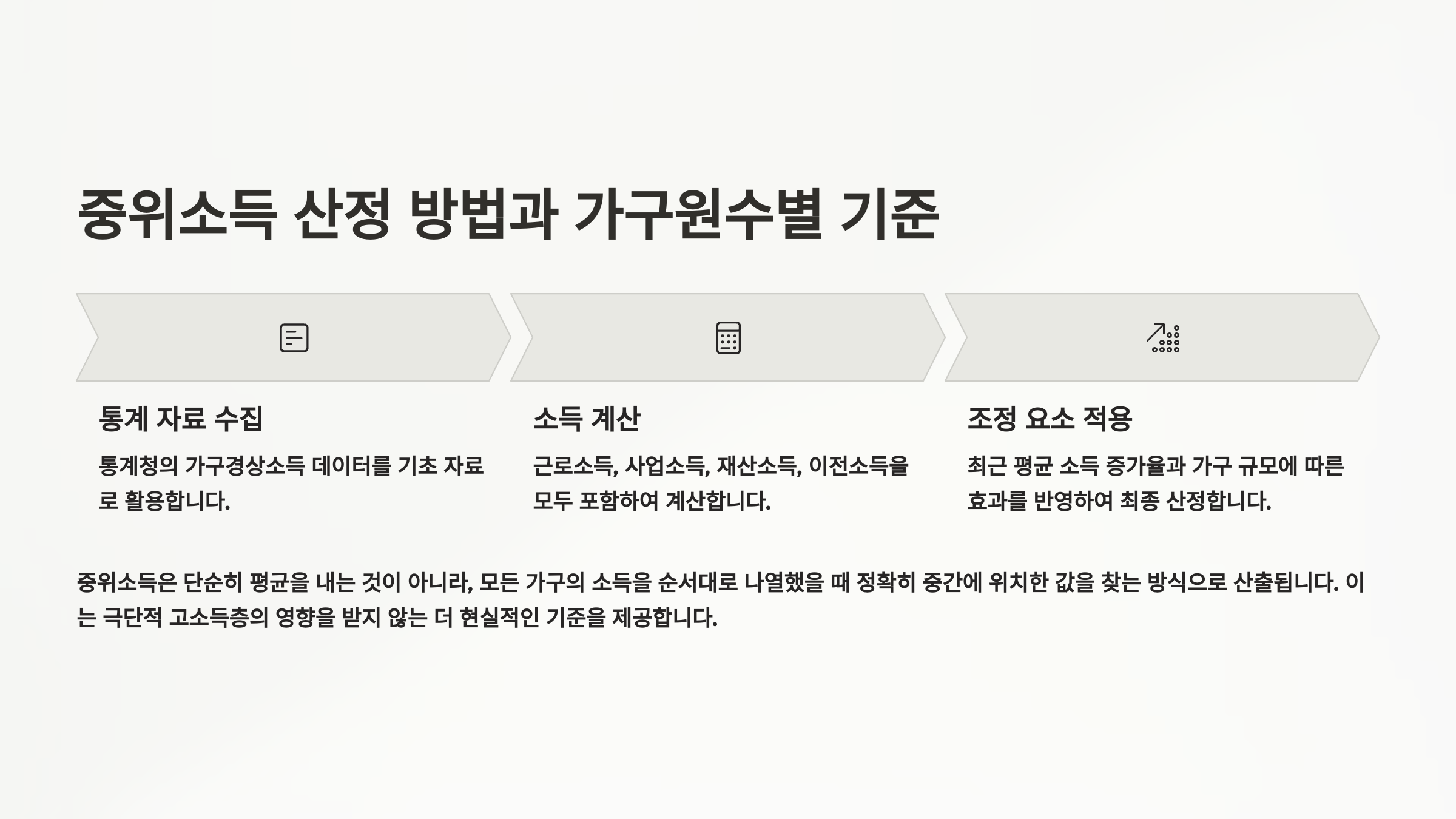 중위소득을 정확히 이해하려면 먼저 어떻게 산정되는지 알아야 해요. 보건복지부는 매년 통계청의 가계금융복지조사 자료를 바탕으로 중위소득을 계산해요. 이 과정은 단순해 보이지만 실제로는 꽤 복잡한 통계적 절차를 거쳐요. 최근 3개년도의 가구 소득 중앙값을 평균내고, 여기에 물가상승률과 경제성장률을 반영해서 다음 연도 기준을 정하죠.