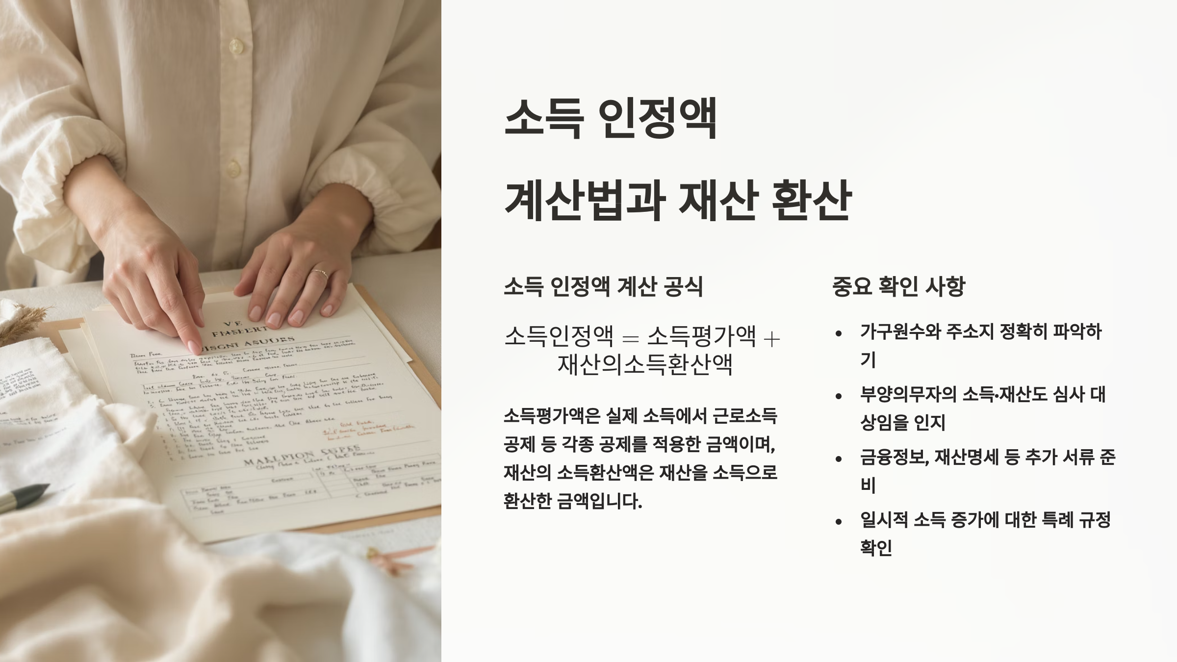 복지 수급자격을 판단할 때 가장 중요한 게 '소득인정액'이에요. 많은 분들이 월급만 생각하시는데, 실제로는 재산을 소득으로 환산한 금액까지 합쳐서 평가해요. 소득인정액 = 소득평가액 + 재산의 소득환산액 이라는 공식으로 계산되죠. 이 계산법을 정확히 이해하면 왜 월급은 적은데도 수급자가 되지 못하는지, 또는 어떻게 하면 수급자격을 얻을 수 있는지 알 수 있어요.