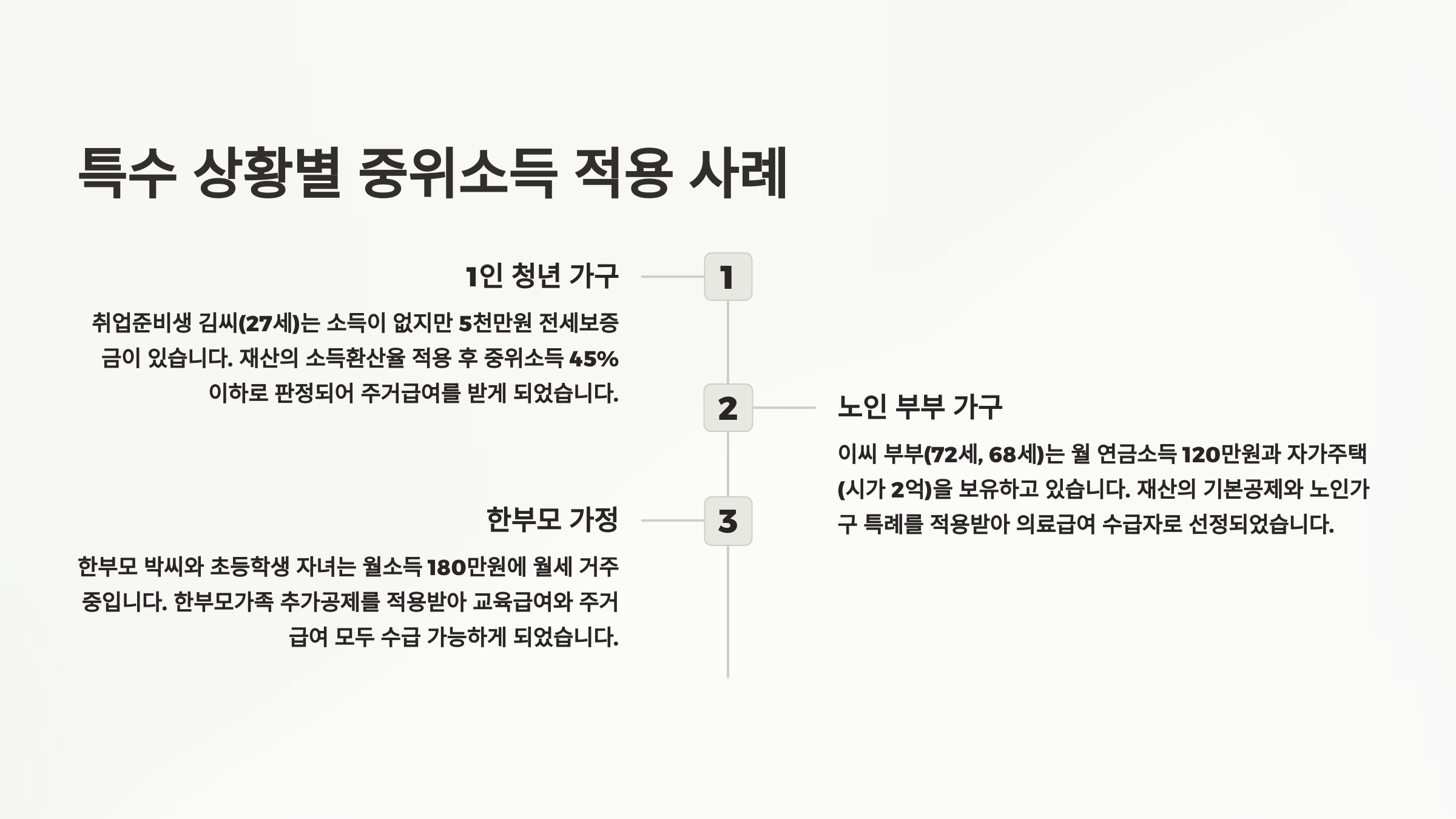 복지 제도를 신청하다 보면 일반적인 기준으로는 판단하기 어려운 특수한 상황들이 많아요. 가족 구성이 복잡하거나, 특별한 사정이 있는 경우 어떻게 중위소득 기준을 적용받는지 구체적인 사례를 통해 알아볼게요. 실제로 이런 특수 상황에 대한 이해 부족으로 복지 혜택을 놓치는 경우가 많거든요. 2025년부터는 이런 사각지대를 해소하기 위한 제도 개선도 이루어졌어요.