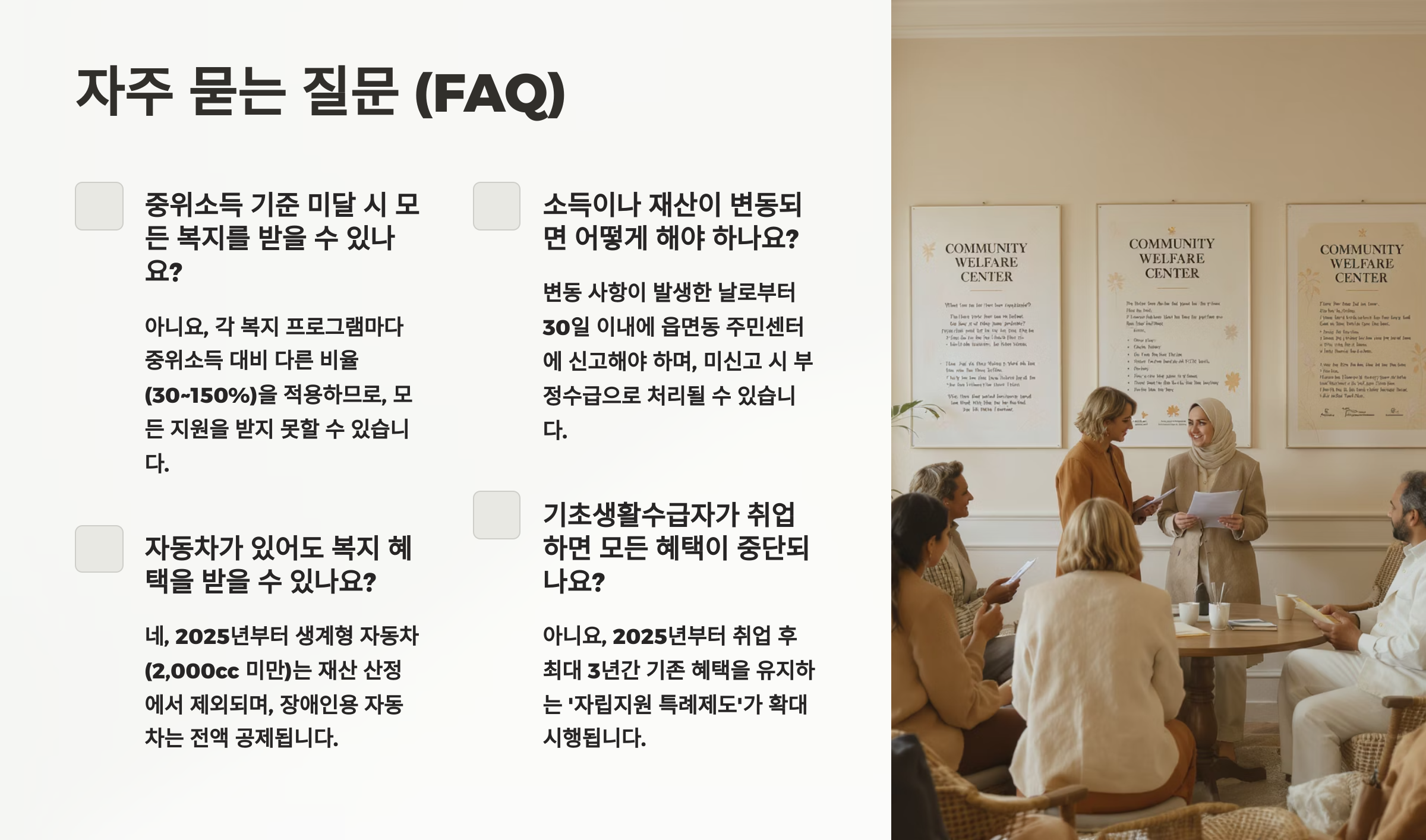 특히 2025년에는 생계급여 기준이 32%로 오르고, 주거급여도 48%로 확대되면서 약 25만 명이 추가로 혜택을 받게 되었어요. 자동차 기준 완화, 재산 기본공제액 인상, 청년과 노인을 위한 특별 지원 확대 등 곳곳에서 positive한 변화가 일어나고 있어요. 이런 변화들이 실제로 어려운 이웃들의 삶에 따뜻한 온기가 되길 바라요.
