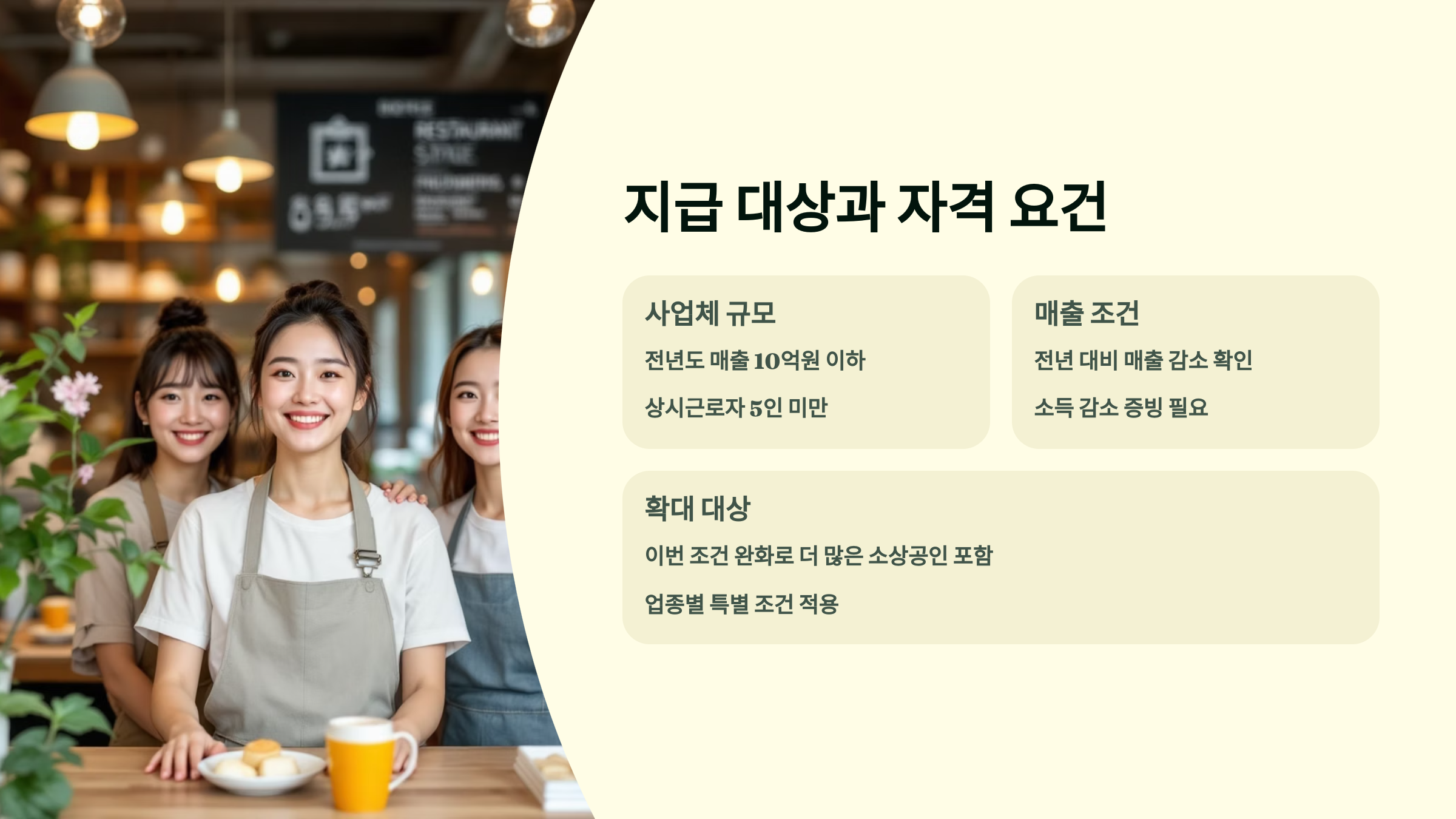 2025년 소상공인 2차 지원금의 지급 대상은 기본적으로 사업자등록을 한 소상공인으로 제한되어 있어요. 하지만 1차 지원금과 달리 더욱 세밀한 자격 요건을 적용해서 실제로 지원이 필요한 사업자들에게 집중적으로 지원하고 있어요. 기본 자격은 2024년 12월 31일 이전에 사업자등록을 완료한 사업자여야 하고, 상시근로자 수가 5명 이하인 소상공인이어야 해요. 또한 2024년 연간 매출액이 전년 대비 10% 이상 감소한 사업자를 우선 지원 대상으로 하고 있어요. 업종별로는 음식점업, 숙박업, 도소매업, 개인서비스업, 학원업 등 대면 서비스가 주된 업종들이 주요 대상이에요.
