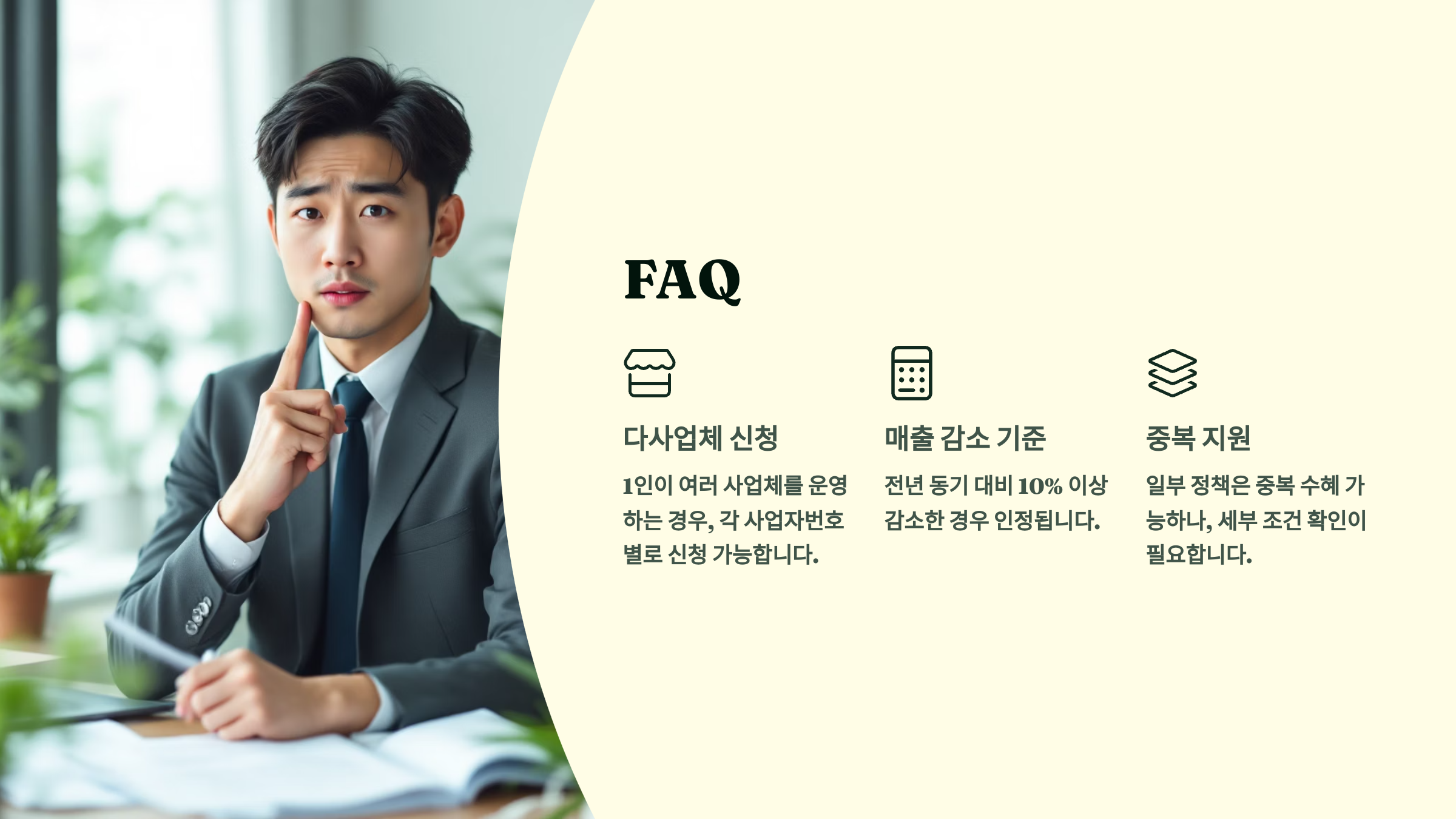 자격 요건 중에서 특히 중요한 것은 매출 감소 증명과 관련된 부분이에요. 2024년 연간 매출액이 2023년 대비 감소했다는 것을 객관적으로 증명해야 하는데, 이를 위해 국세청 홈택스의 매출 데이터나 카드사 매출 데이터, 전자세금계산서 발행 내역 등을 활용하고 있어요. 개인사업자의 경우 부가가치세 신고서상의 매출액을 기준으로 하고, 간이과세자의 경우에는 카드 매출이나 현금영수증 발행 내역을 종합해서 판단해요. 새로 창업한 사업자의 경우에는 별도의 기준을 적용해서 창업일 기준으로 월평균 매출액을 산정해서 비교하고 있어요.