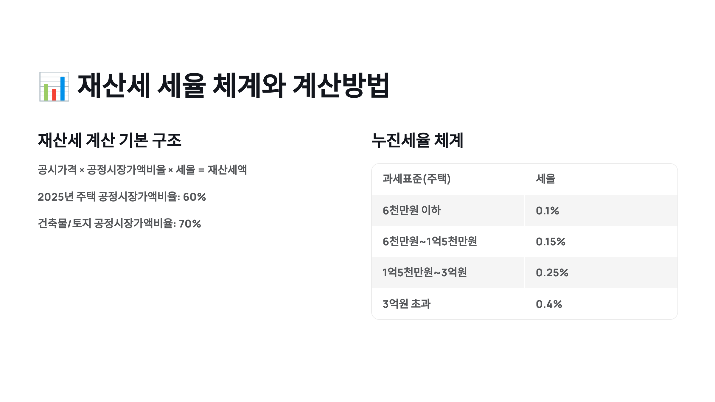 재산세 세율은 누진세 체계로 되어 있어요. 주택의 경우 과세표준이 높아질수록 세율도 함께 올라가는 구조랍니다. 2025년 기준으로 일반 주택의 경우 6천만원 이하는 0.1%, 6천만원 초과 1억5천만원 이하는 6만원에 초과금액의 0.15%를 더한 금액을 내야 해요.