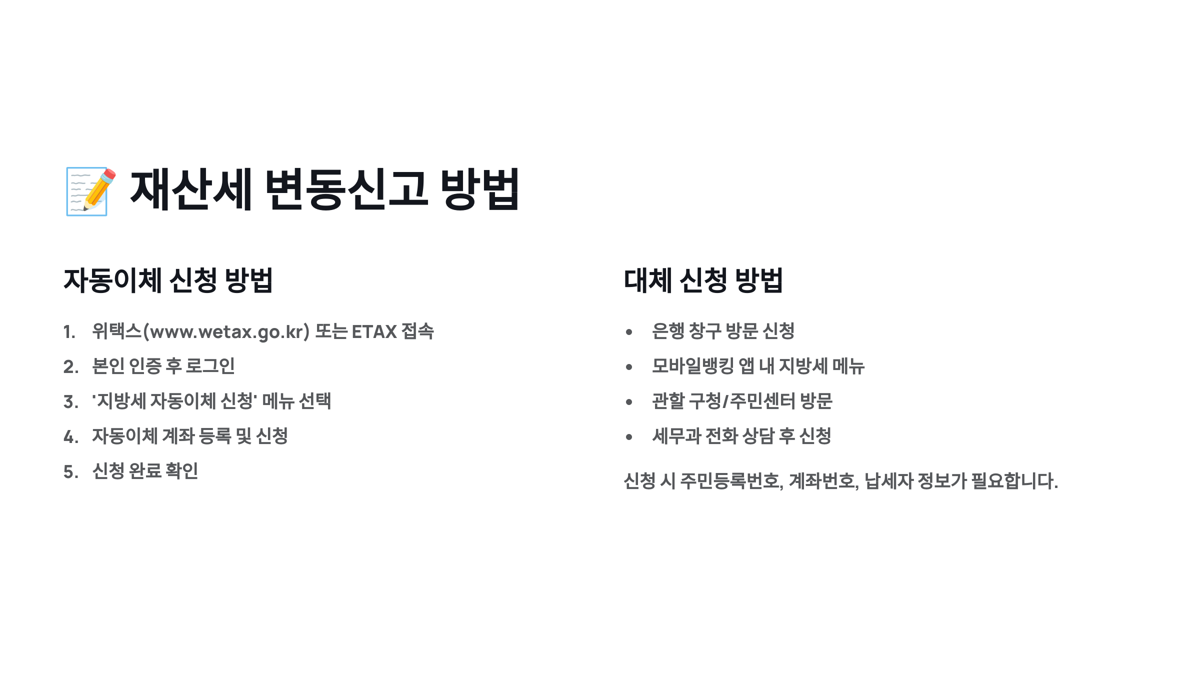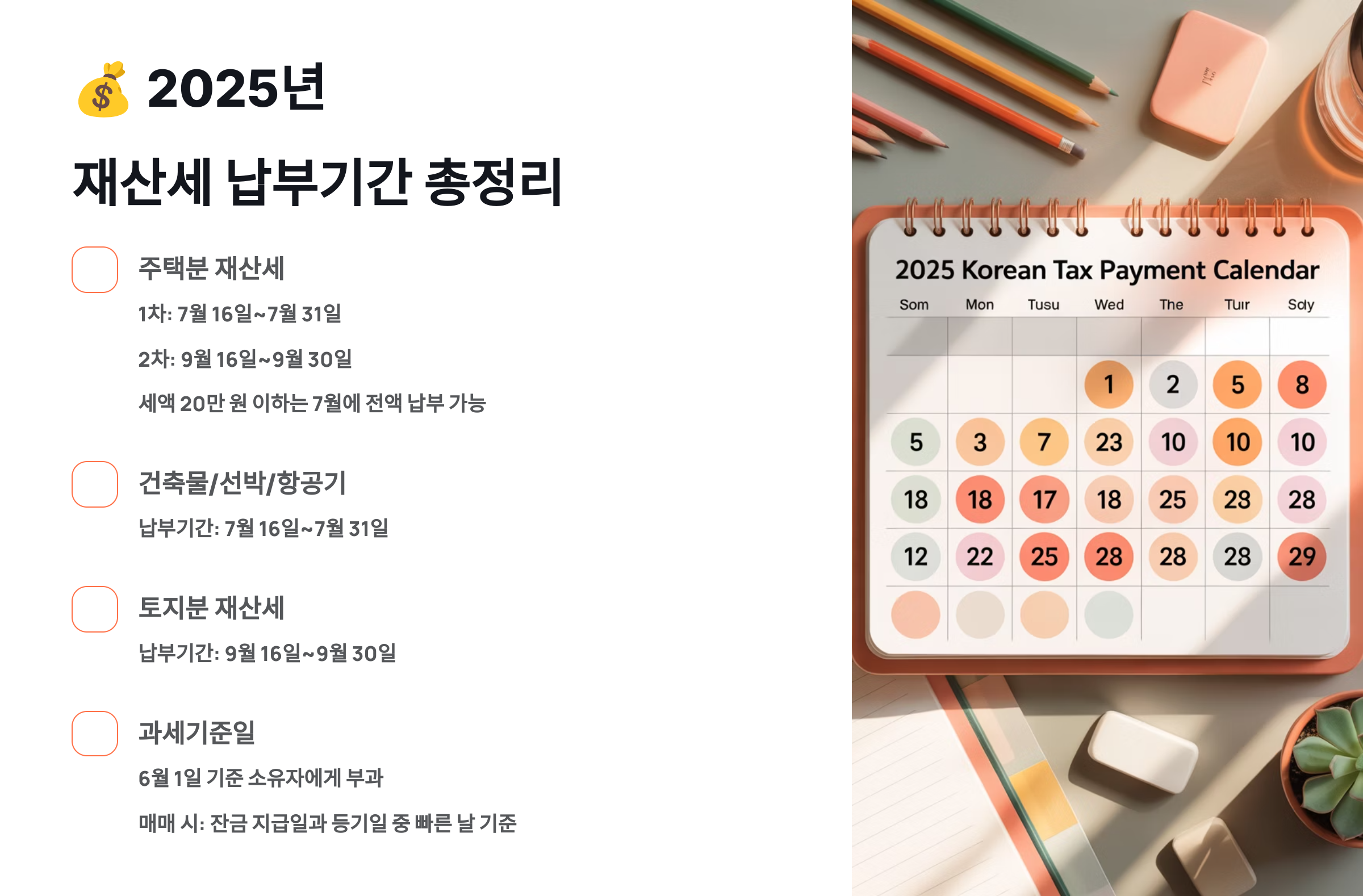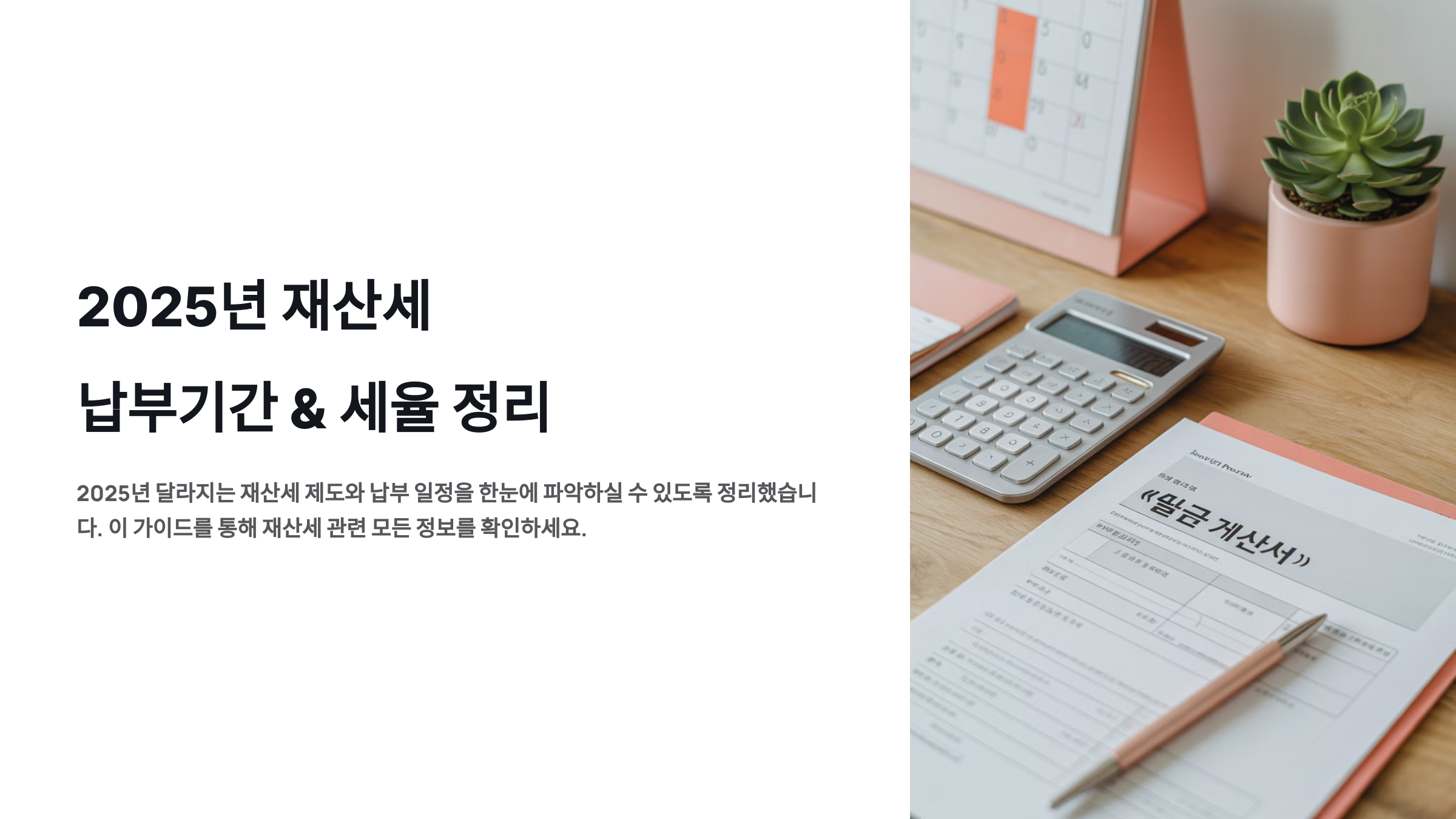 2025년 재산세 납부시즌이 다가오면서 많은 분들이 납부기간과 세율에 대해 궁금해하고 계세요. 특히 올해부터 변경되는 세율과 공정시장가액비율, 그리고 편리한 자동이체 신청방법까지 꼼꼼히 알아두면 세금 납부가 한결 수월해진답니다. 이번 포스팅에서는 2025년 재산세의 모든 것을 상세히 정리해드릴게요.