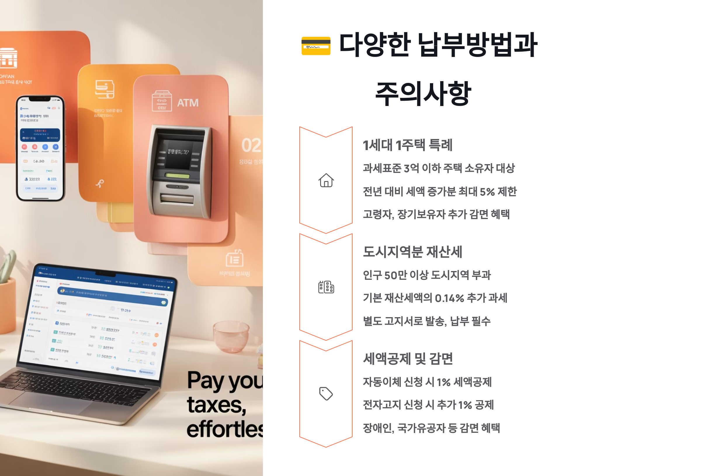 주택분 재산세는 납세자의 부담을 덜어주기 위해 2회에 걸쳐 분할 납부하게 되어 있어요. 7월에는 전체 세액의 50%를, 9월에는 나머지 50%를 납부하면 돼요. 다만 재산세 세액이 20만원 이하인 경우에는 7월에 전액을 일괄 납부하게 되고, 250만원을 초과하는 고액 납세자의 경우에는 별도의 분할납부 신청을 통해 더 여러 번에 나누어 낼 수도 있답니다.