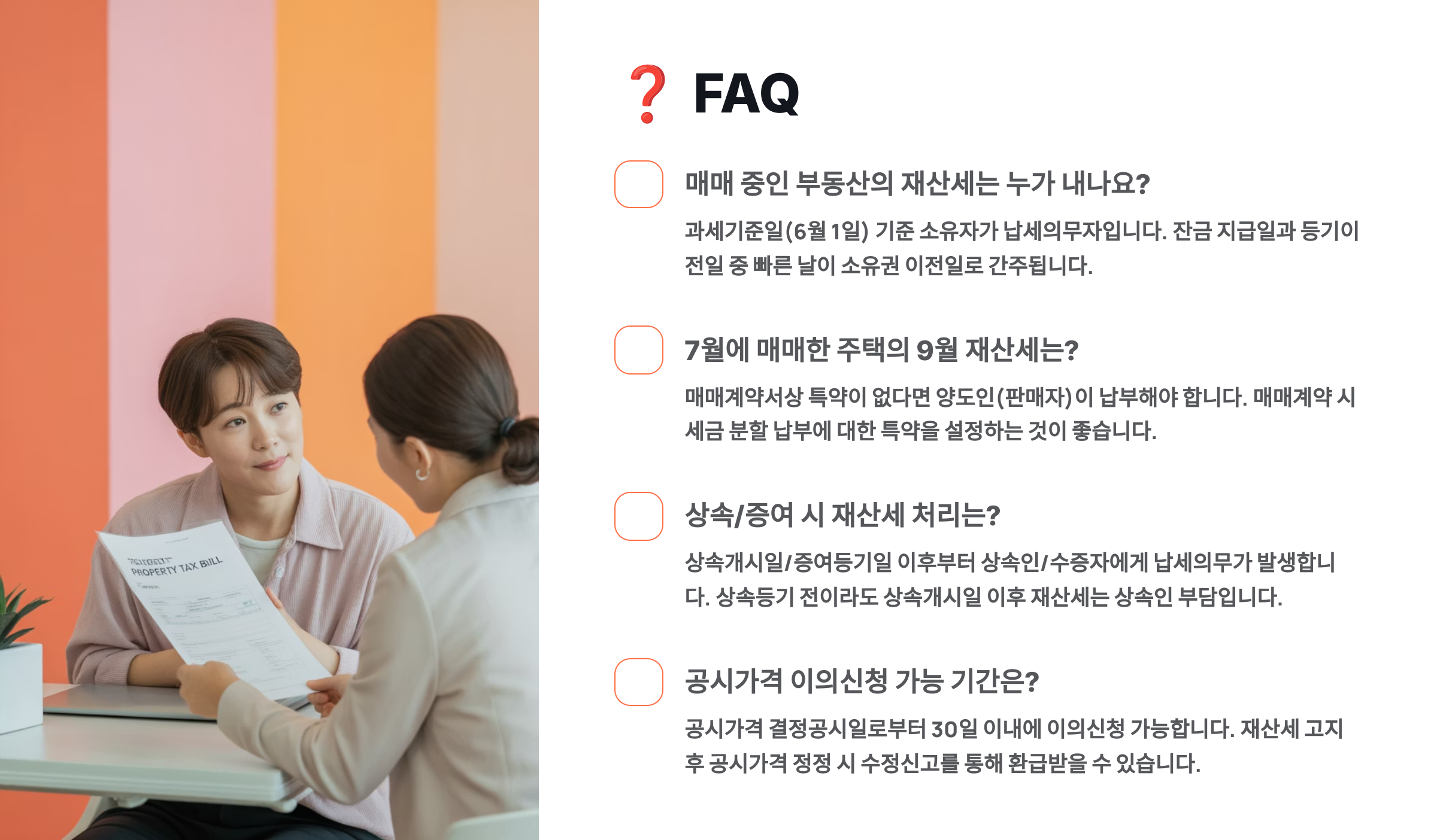 예를 들어 5월 30일에 잔금을 지급하고 6월 5일에 등기를 했다면, 5월 30일이 기준이 되어 매수자가 재산세를 내야 해요. 반대로 6월 5일에 잔금을 지급하고 6월 10일에 등기를 했다면, 6월 1일 기준으로는 매도자가 소유자이므로 매도자가 납부해야 해요.