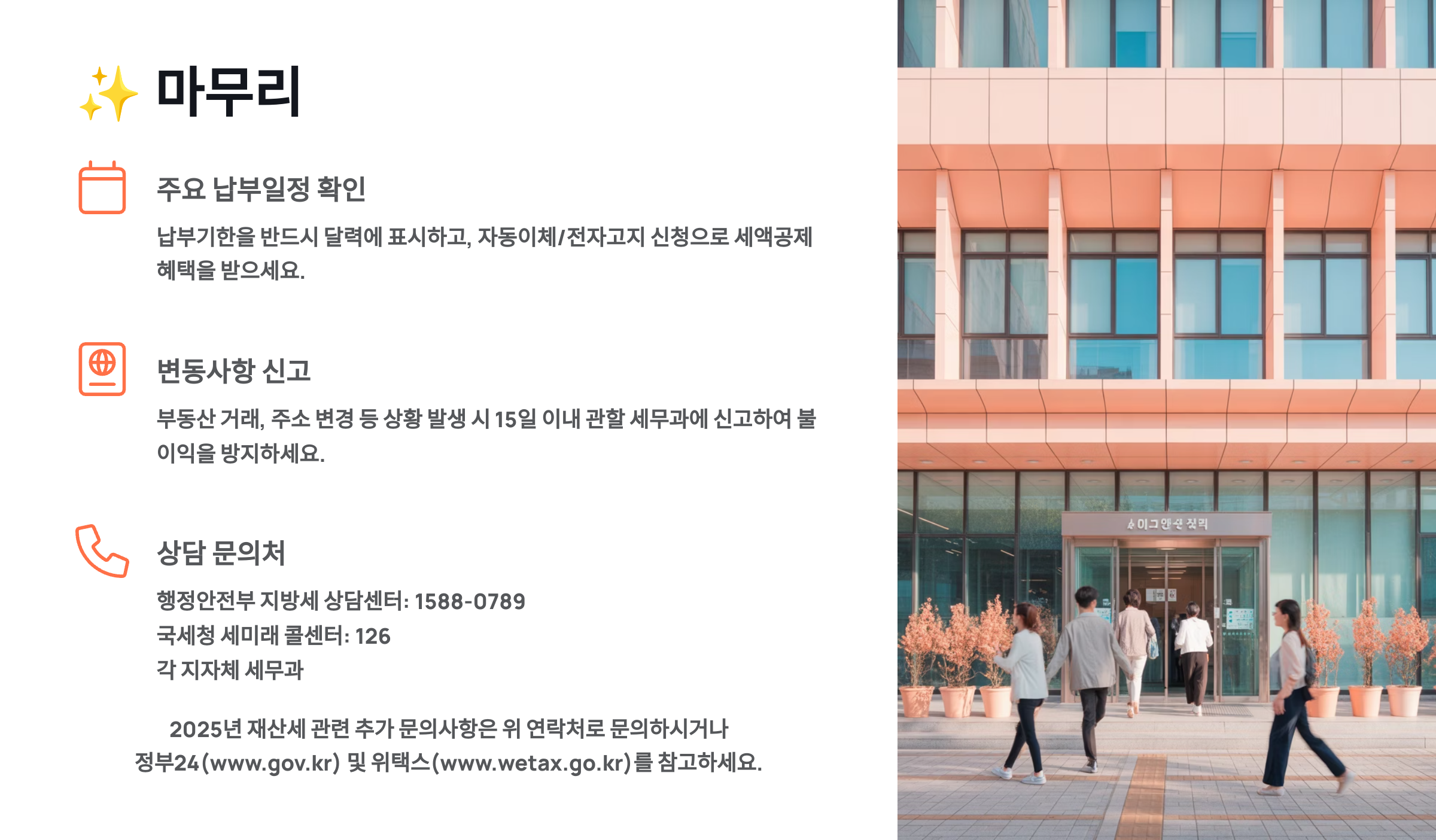 납부기한을 꼭 지켜서 불필요한 가산세를 내지 않도록 주의하시고, 자동이체를 신청해두면 매년 걱정 없이 납부할 수 있어요. 부동산 거래 시에는 재산세 부담 주체를 명확히 정하는 것도 잊지 마세요. 이 글이 여러분의 재산세 납부에 도움이 되었기를 바라며, 궁금한 점이 있다면 관할 구청이나 위택스를 통해 문의해보세요! 😊