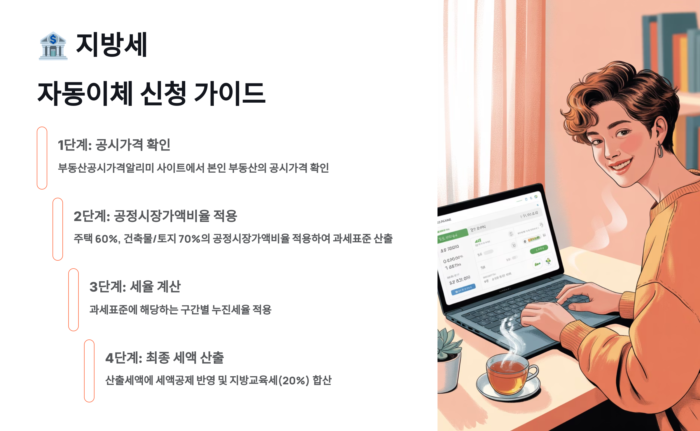 재산세 계산은 공시가격 × 공정시장가액비율 × 세율로 구해요. 예를 들어 공시가격 5억원인 아파트의 경우, 5억원 × 60% × 해당세율을 적용하면 돼요. 여기에 도시지역분(과세표준의 0.14%)과 지방교육세(재산세액의 20%)가 추가로 부과된답니다.